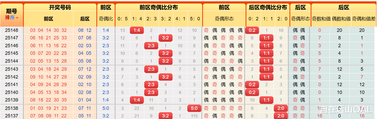 奇偶调整:前区连续多期偶数占优(148期1:4,147期2:3),下期应重点防范奇数强势回补。关注如 01、05、11、15、23 等奇数号码。