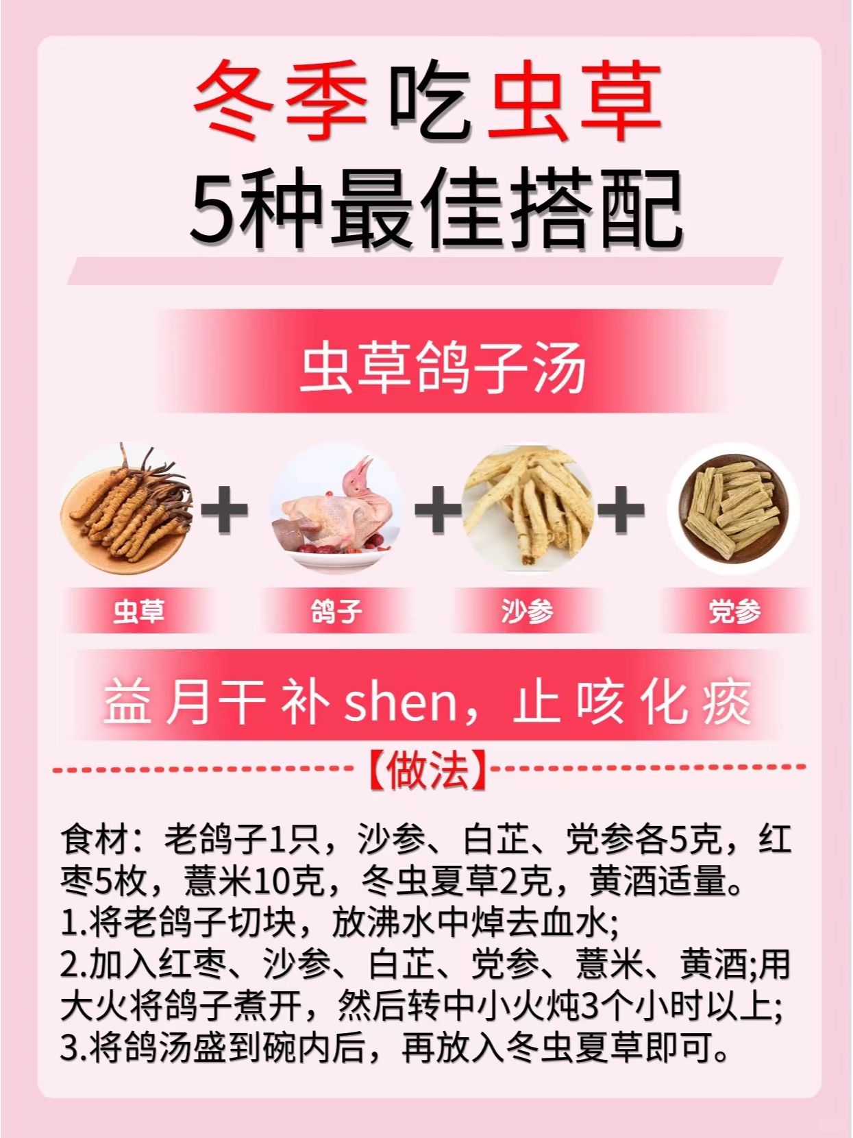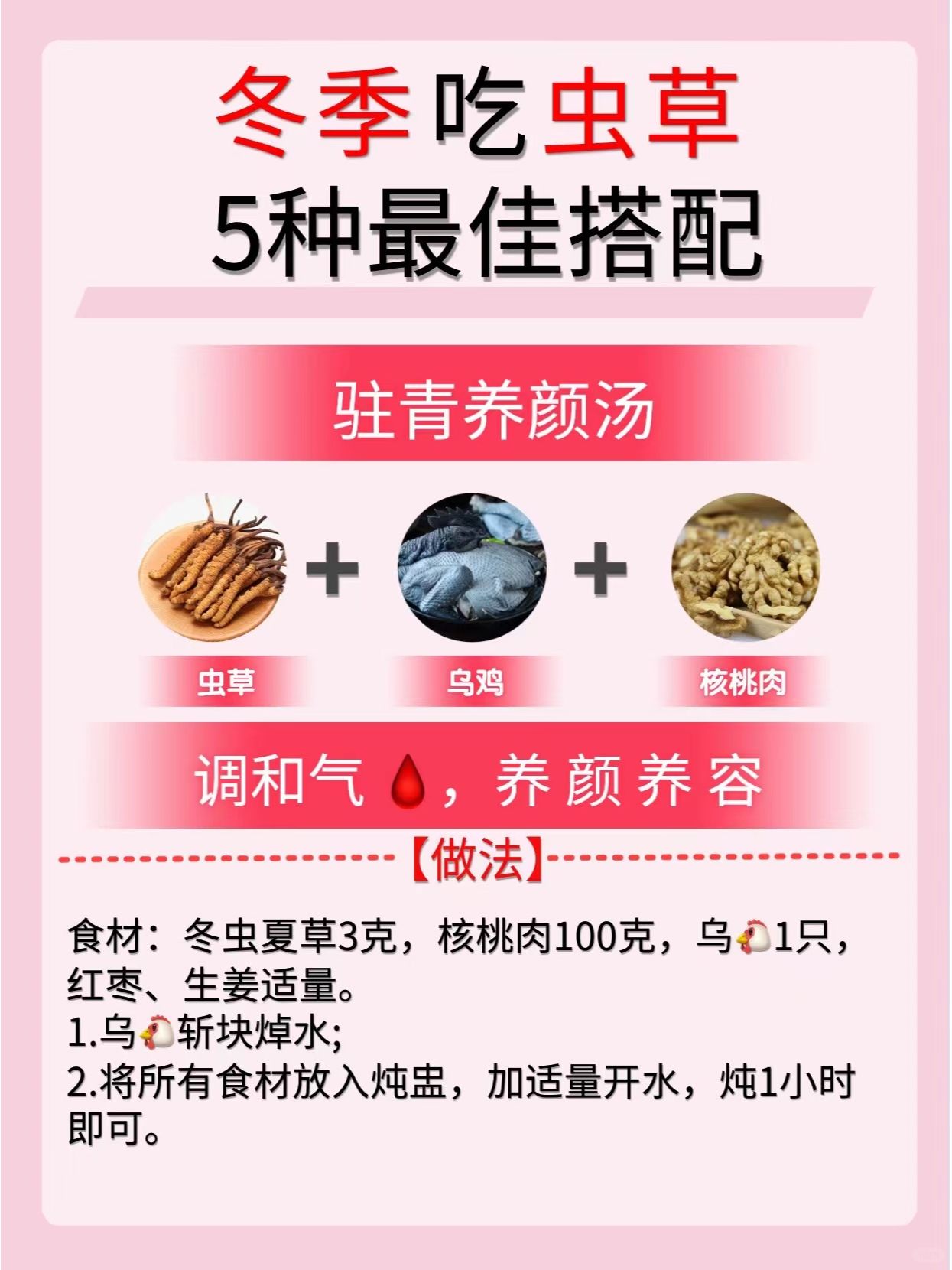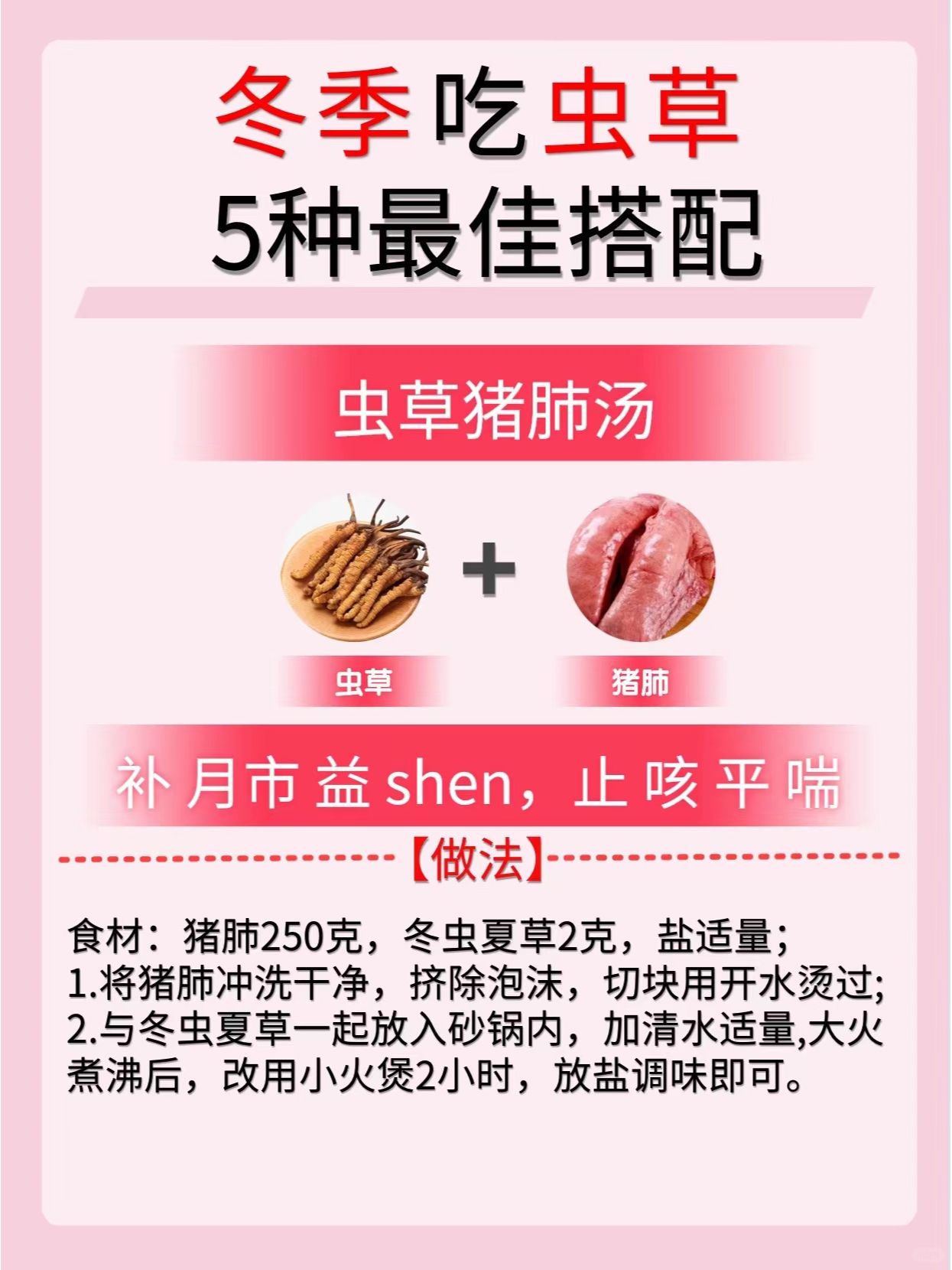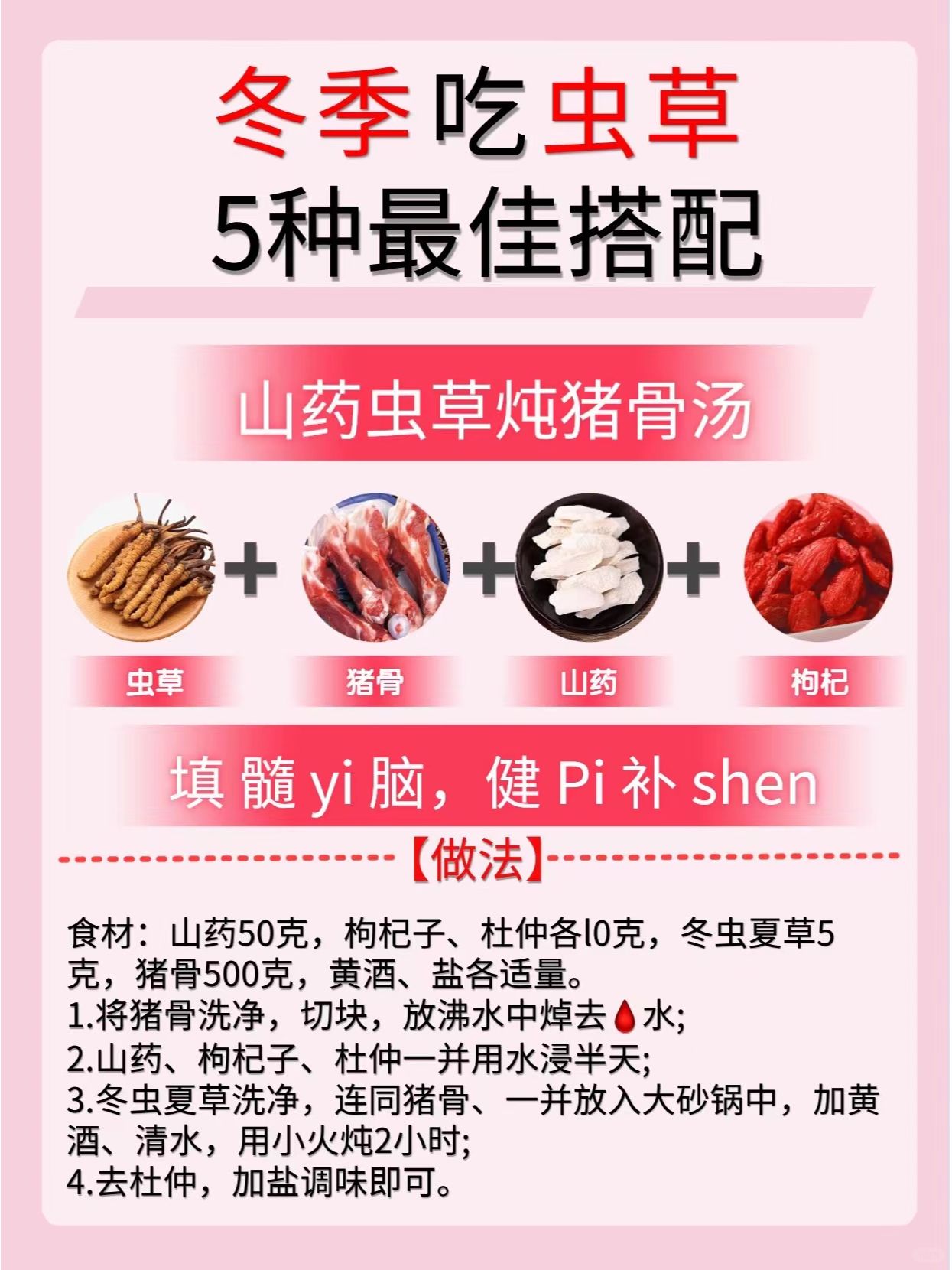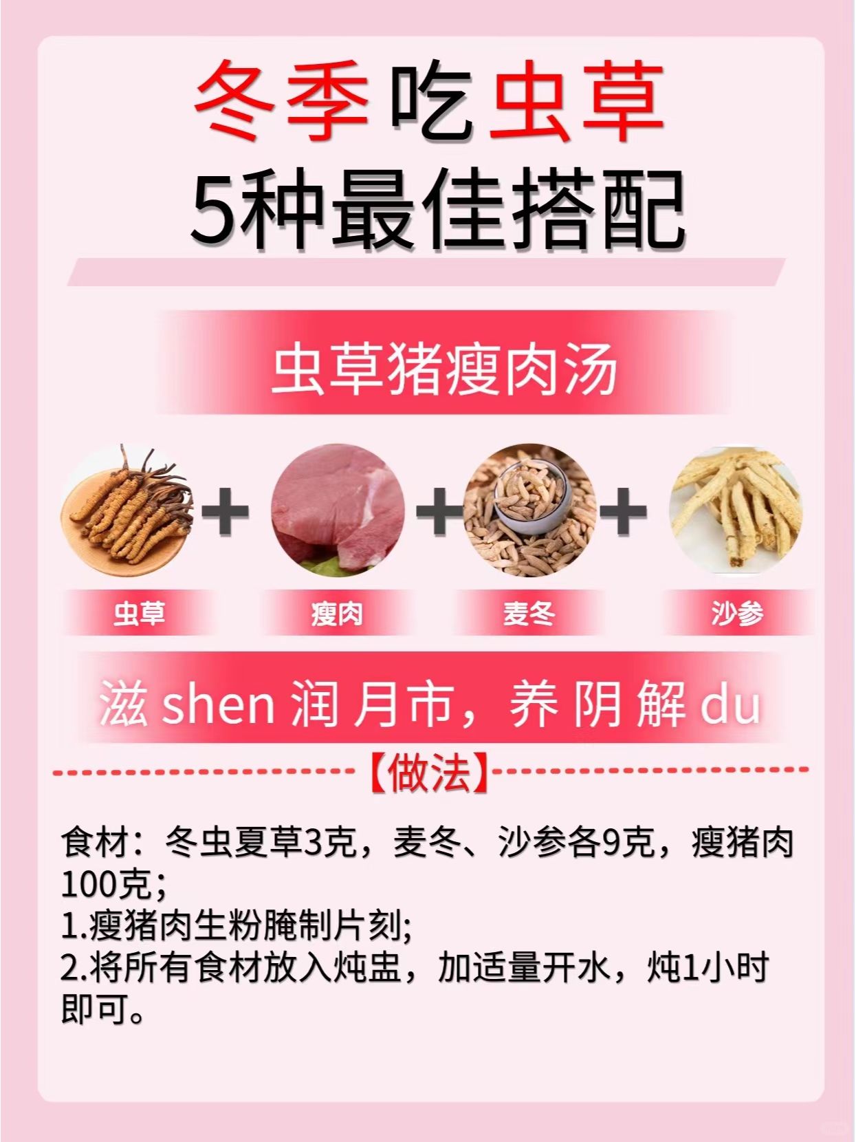 冬虫夏草在藏语中被称为“雅扎滚布”(即冬天是昆虫,夏天是草)。冬季真菌寄生在虫草蛾幼虫体内,在夏季发育。因此,冬虫夏草得名!古籍认为,冬虫夏草进入肺肾两经,不仅可以补充肺阴,还可以补充阳气,同时平衡和调节阴阳💊材。它搭配起食材来营养又美味。 —— ①驻青养颜汤 ②冬虫草猪肉汤 ③冬虫草鸽子汤 ④冬虫草猪肺汤 ⑤山药冬虫草炖猪骨 🌸今天的分享就到这里了,希望大家喜欢🌸 持续关🐷我,每天分享更多养生小知识哦~