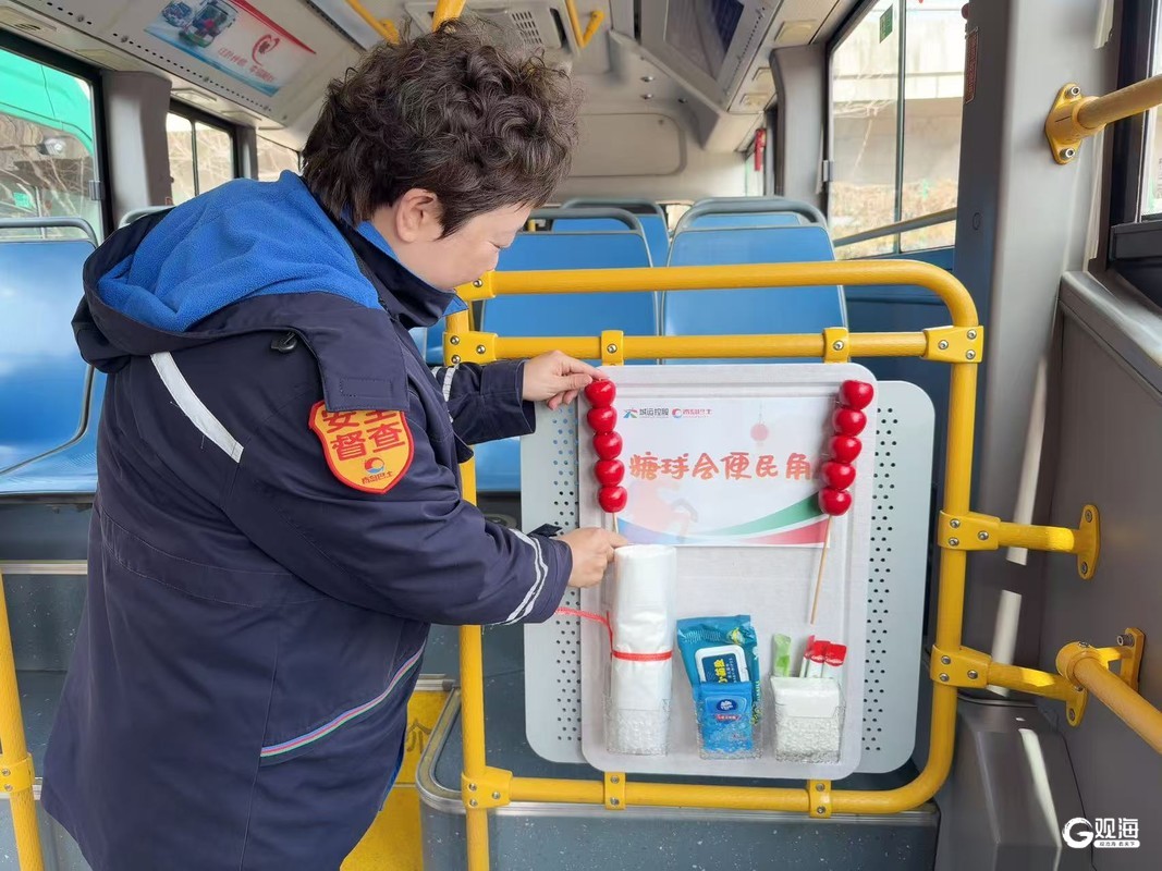 “刚买了串糖球,黏糊糊的手正愁没地方擦,一抬头看见车厢里有湿巾,这服务真是想到我们心坎里去了。”带着孩子逛会的市民李先生对此赞不绝口。塑料袋也成了抢手货,有的用来装刚买的民俗小玩意,有的则用来临时装果皮垃圾,保持了车厢的整洁。除了这些消耗品,车厢内还延续了往年的特色布置。今年的5路车依旧挂着红彤彤的拉花和中国结。驾驶员们还在发车间隙客串“导游”。