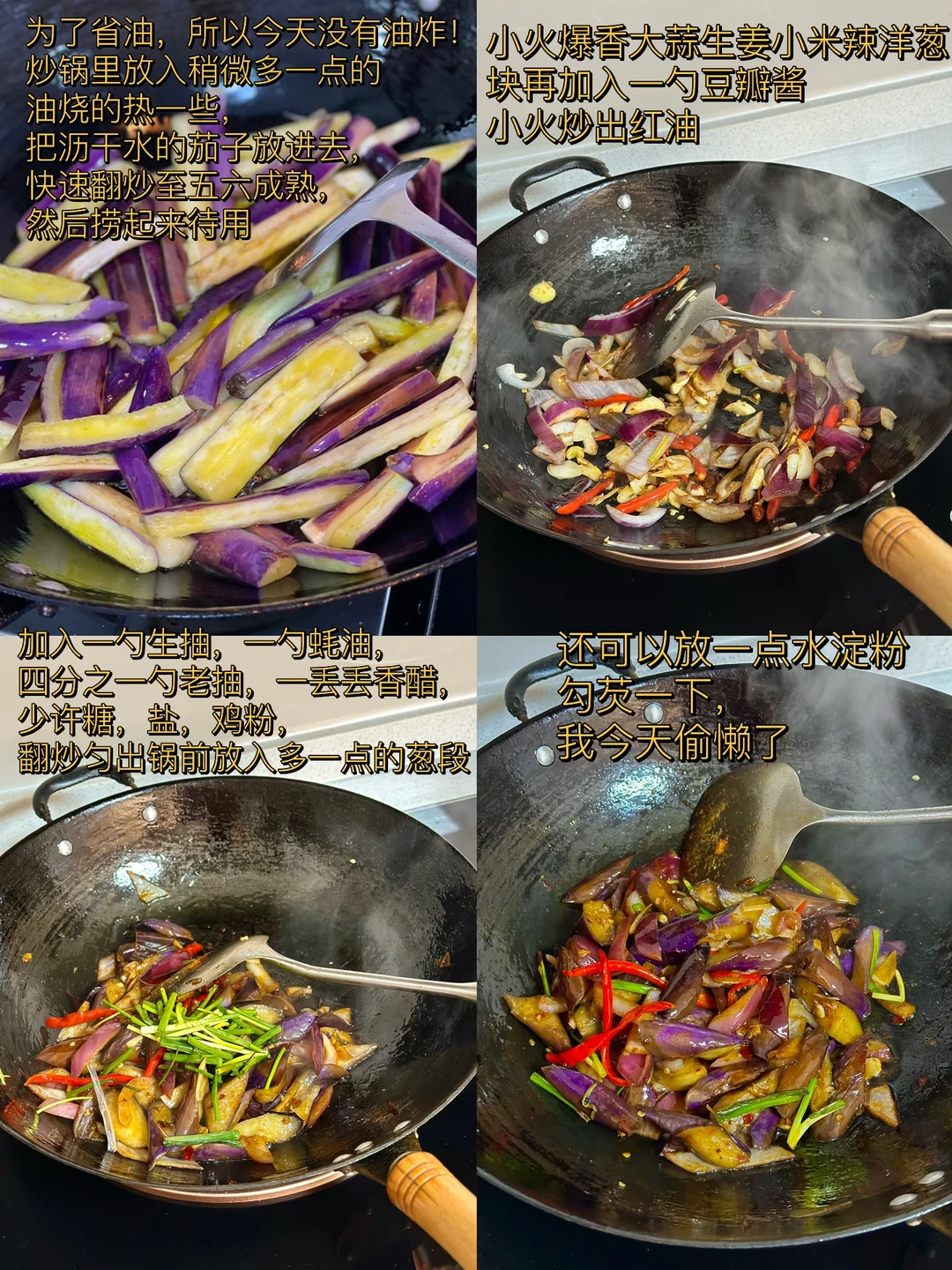 3. 为了省油,所以今天没有油炸!炒锅里放入稍微多一点的油烧的热一些,把沥干水的茄子放进去,快速翻炒至五六成熟,然后捞起来待用