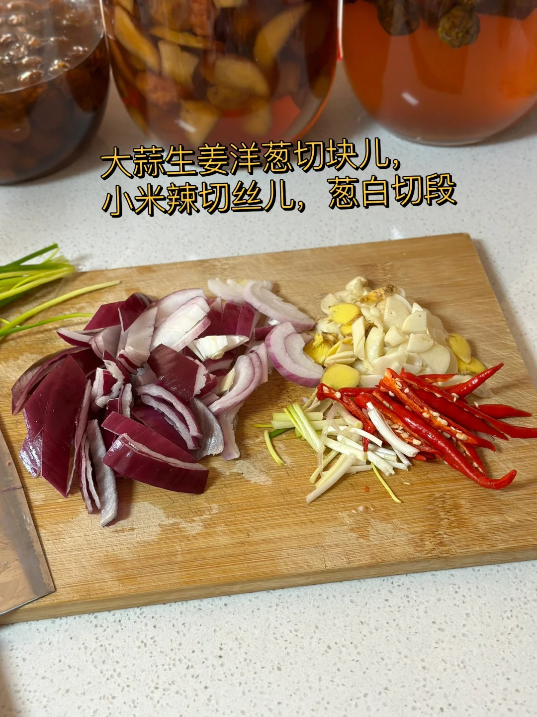 2. 大蒜生姜洋葱切块儿,小米辣切丝儿,葱白切段