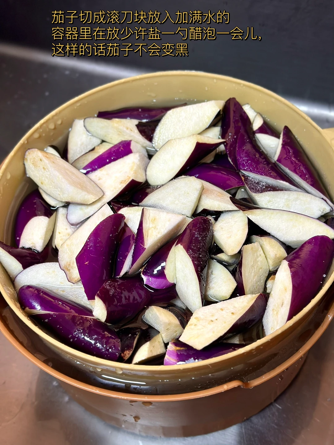 1. 茄子切成滚刀块放入加满水的容器里在放少许盐一勺醋泡一会儿,这样的话茄子不会变黑
