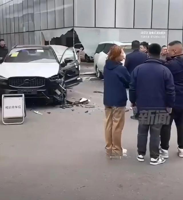 当车辆冲进道闸后,突然加速从两车之间的间隙向前冲,最后直接冲进了前面的一家4S 店,一路狂撞多辆沃尔沃和别克。