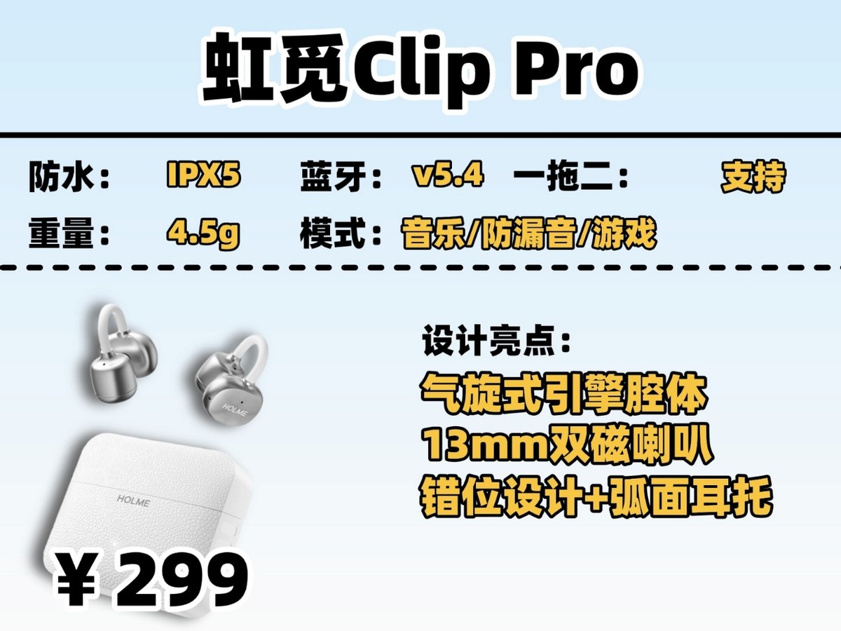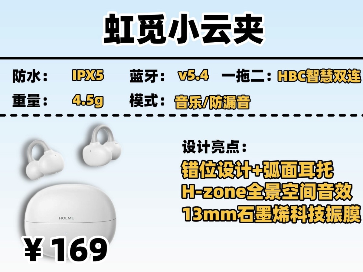 这款耳机的佩戴可就有意思了,它使用的是前高后低的2.5mm错位设计,可以完美贴合耳朵轮廓;电池部分搭配的是12度弧面耳托设计,又进一步提升了对耳朵的贴合度与舒适度。耳机单耳重量仅有4.5g,佩戴时几乎没有一点夹耳感,十分轻盈。音质上,它采用的是13mm石墨烯科技振膜单元,凭借稳定的形变优势,耳机可以精准的呈现出声音的各类细节,还有H-zone全景空间音效加持,让现场感更强,声音也更细腻饱满。性能方面,他还支持虹觅自研防漏音模式,开启后有很强的降漏音效果;还采用了蓝牙5.4芯片,设备连接稳定,更有意思的是他还支持HBC智慧双联功能,一副耳机可以分成两副耳机使用,还支持IPX5级的防水效果,可以说是百元耳夹式蓝牙耳机中的全能选手。