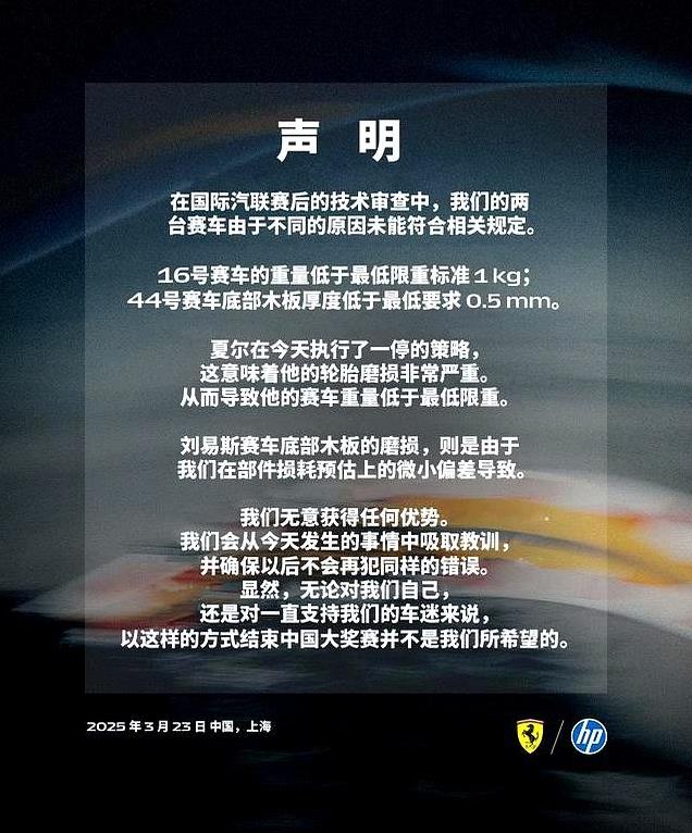 法拉利车队事后也发了声明,解释说勒克莱尔是因为比赛策略导致轮胎过度磨损,所以才轻了那么一点儿。汉密尔顿那边呢,说是对零件损耗的预估有点儿偏差。总之,就是“无心之失”,绝非故意。但这事儿吧,还是引起了不少争议。有人就说了,法拉利好歹也是个老牌强队,技术实力摆在那儿,怎么可能犯这种低级错误?这1公斤和0.5毫米的差距,真的是不小心,还是故意钻空子,想占点儿便宜?这就像考试一样,规定要用0.5毫米的笔芯,你非要用0.35的,写出来的字细一点,能多写几个字。虽然看着没啥大区别,但严格来说,就是违规了。