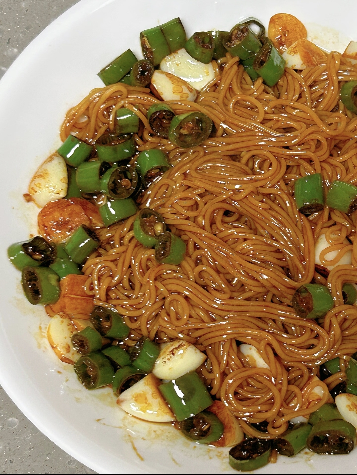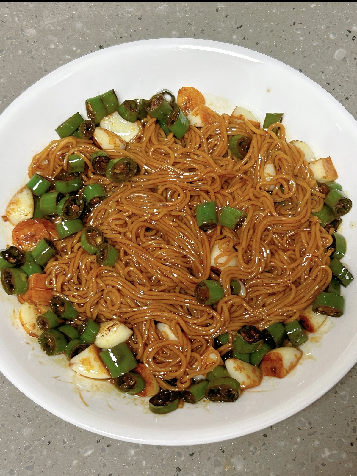 端上桌,热气裹挟着蒜香和辣香扑面而来,夹起一筷子面条,油亮的酱汁挂在面上,入口先是面条的筋道,接着是蒜的醇厚、辣椒的鲜辣,生抽和蚝油的鲜味在舌尖散开,白糖的甜味中和了辣味,让整体口感更有层次。每一口都香辣入味,越吃越上头,连平时不爱吃蒜的家人都忍不住多吃了几口。