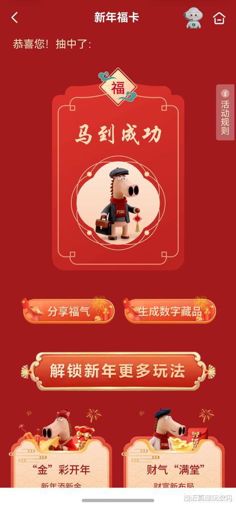 除此之外,鸿蒙版邮储银行还新增了年味满满的3D桌面卡片。添加到桌面,你就能拥有一只新春吉祥物!而且这张3D卡片不光是“靠颜值吃饭“,更是超便捷的福利“传送门”,点击卡片上的“新年福卡 ”,就能直接跳转到鸿蒙版邮储银行的“新春活动”页面。马年新年,只要点开App就能随机抽取新年福卡,主打一个轻松赢好运~