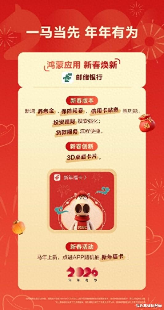 华仔已解冻95%,春节的脚步越来越近了,买年货、购新年战袍、准备拜年红包等等一套操作下来,银行卡真要保不住了!还好,最近鸿蒙版邮储银行进行了大更新,不仅功能全面升级,还有新年福卡可以领取,把整个春节的氛围感都拉满了,鸿蒙用户千万别错过。