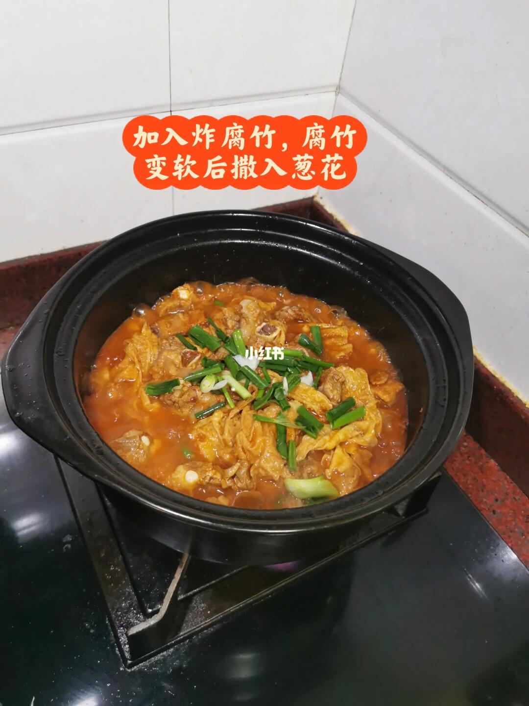 【4】、把炸过的腐竹放入砂锅底部,把焖好的排骨倒入砂锅,小火煮五分钟,把腐竹煮软,撒入葱花即可。