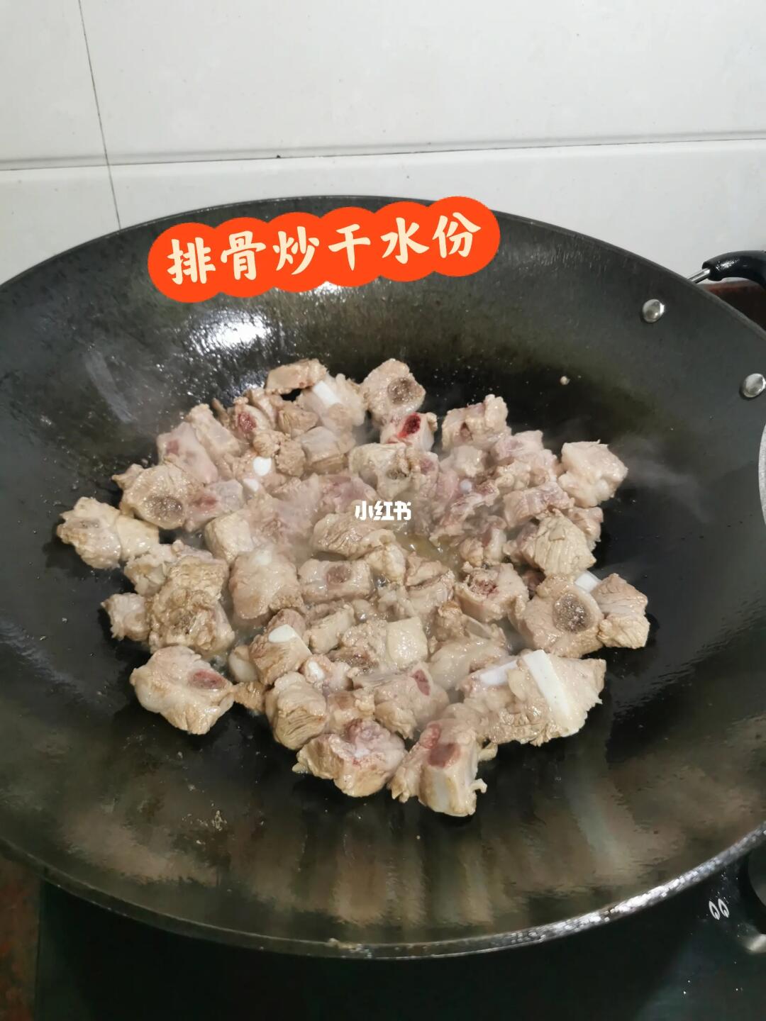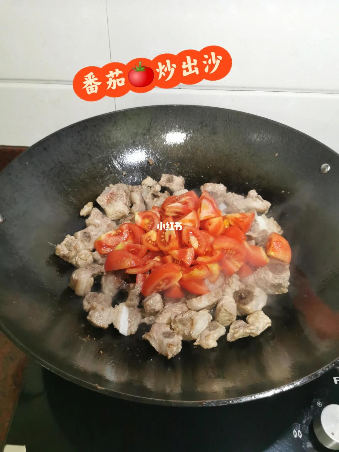 【2】、起锅热油,把排骨放入锅里,炒干水份,炒至排骨表面有点焦黄,加入番茄丁,炒出沙。