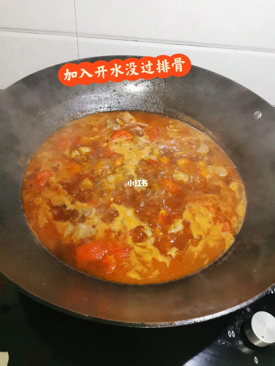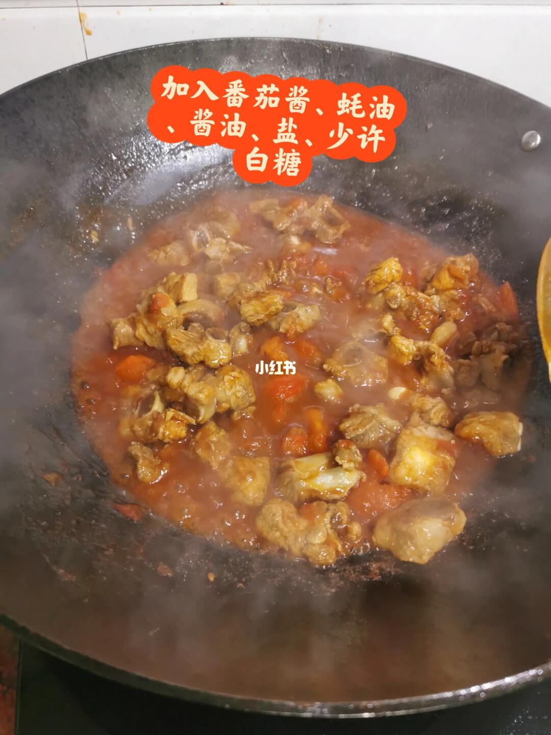 【3】、加入番茄酱、蚝油、酱油、一点点盐、一点点白糖,翻炒出香味,加入开水没过排骨,大火煮开后转小火焖20分钟。