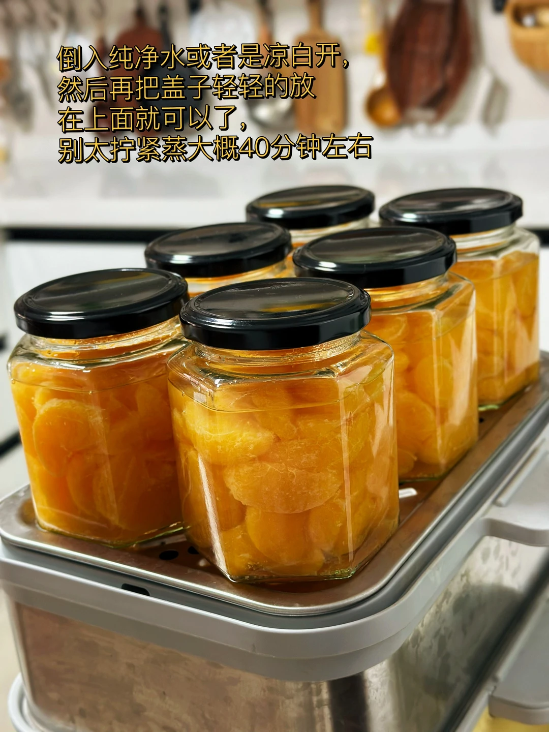 6. 倒入纯净水或者是凉白开,然后再把盖子轻轻的放在上面就可以了,别太拧紧蒸大概40分钟左右(时间不绝对蒸好的明显感觉橘瓣变软)