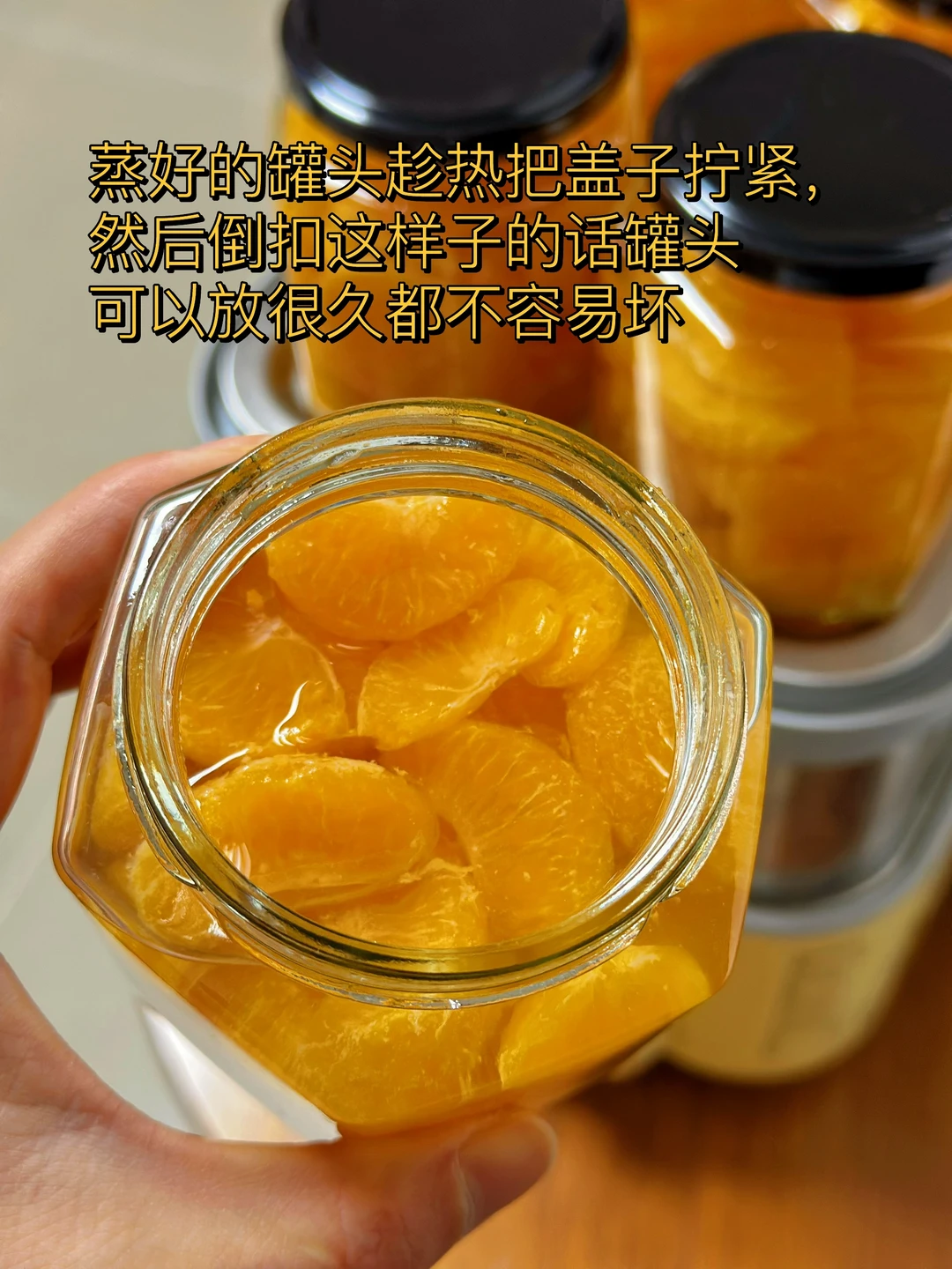 7. 蒸好的罐头趁热把盖子拧紧然后倒扣这样子的话啊罐头可以放很久都不容易坏