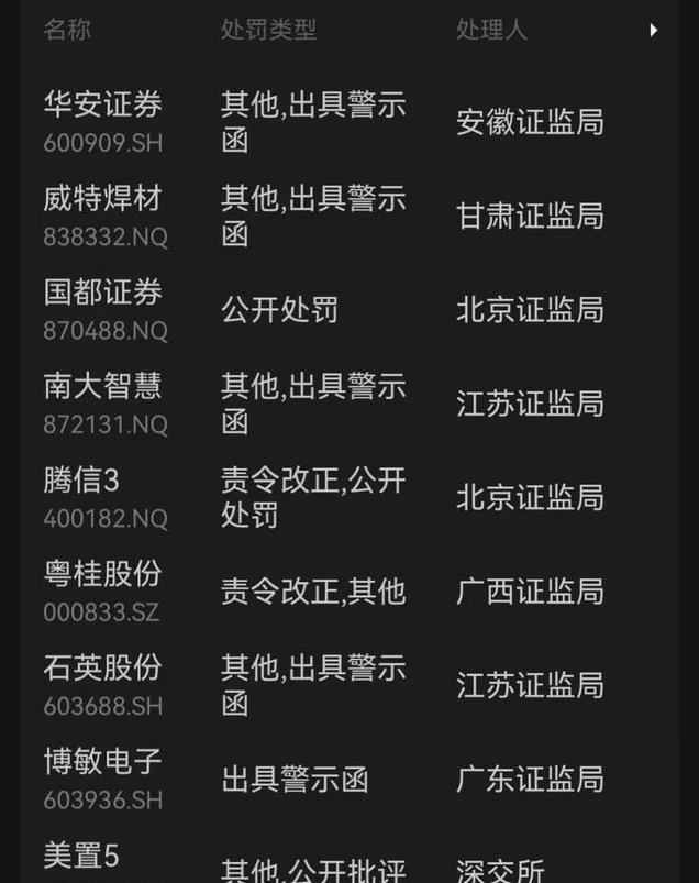 此外,还有其他一些公司,比如华安证券、威特焊材、国都证券等,也因为各种违规行为被监管机构处罚。这些违规行为包括违反证券投资基金管理办法、未履行重大事件信息披露义务、会计处理不符合企业会计准则等。