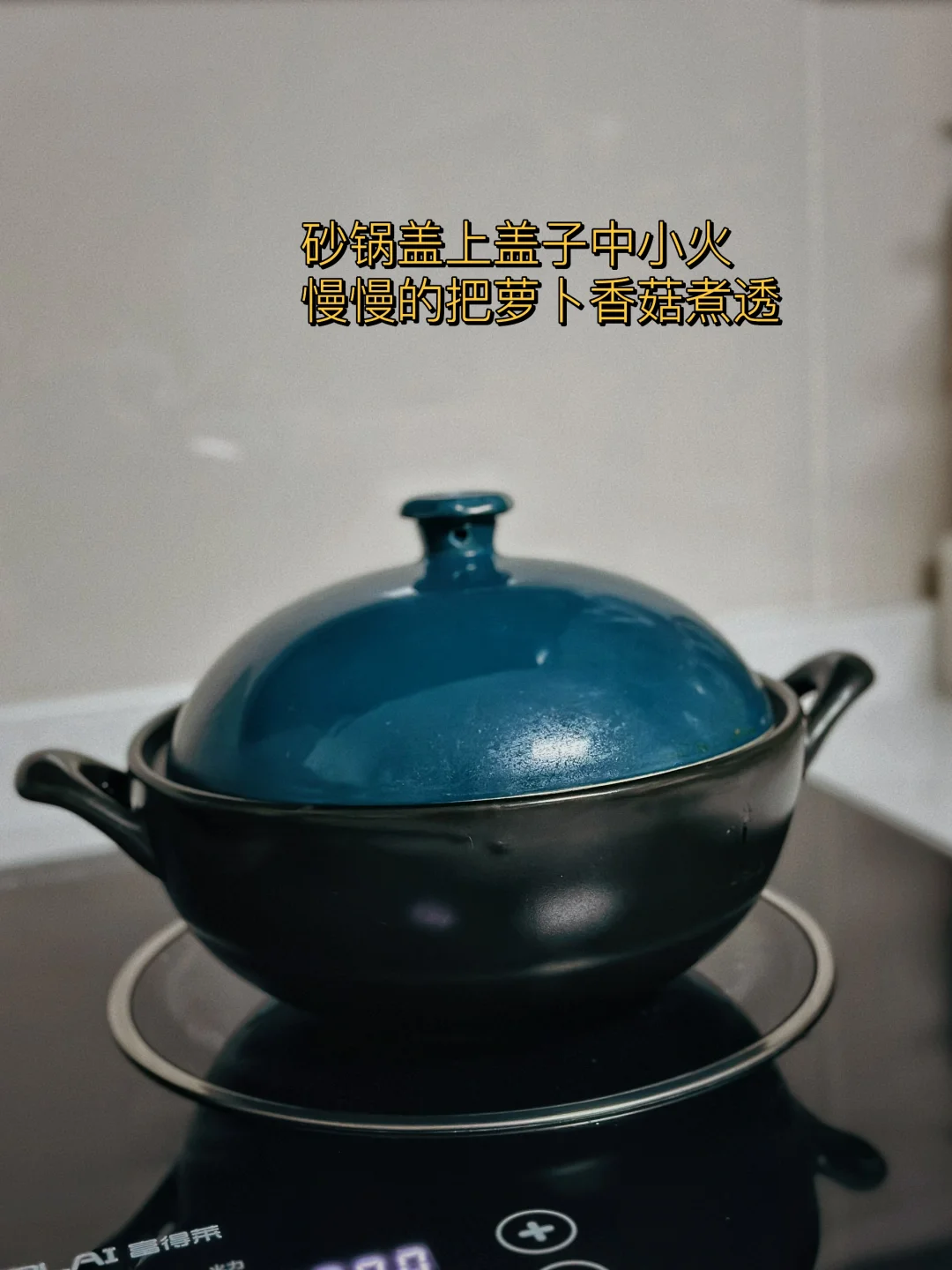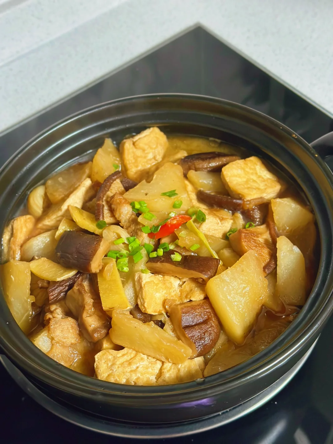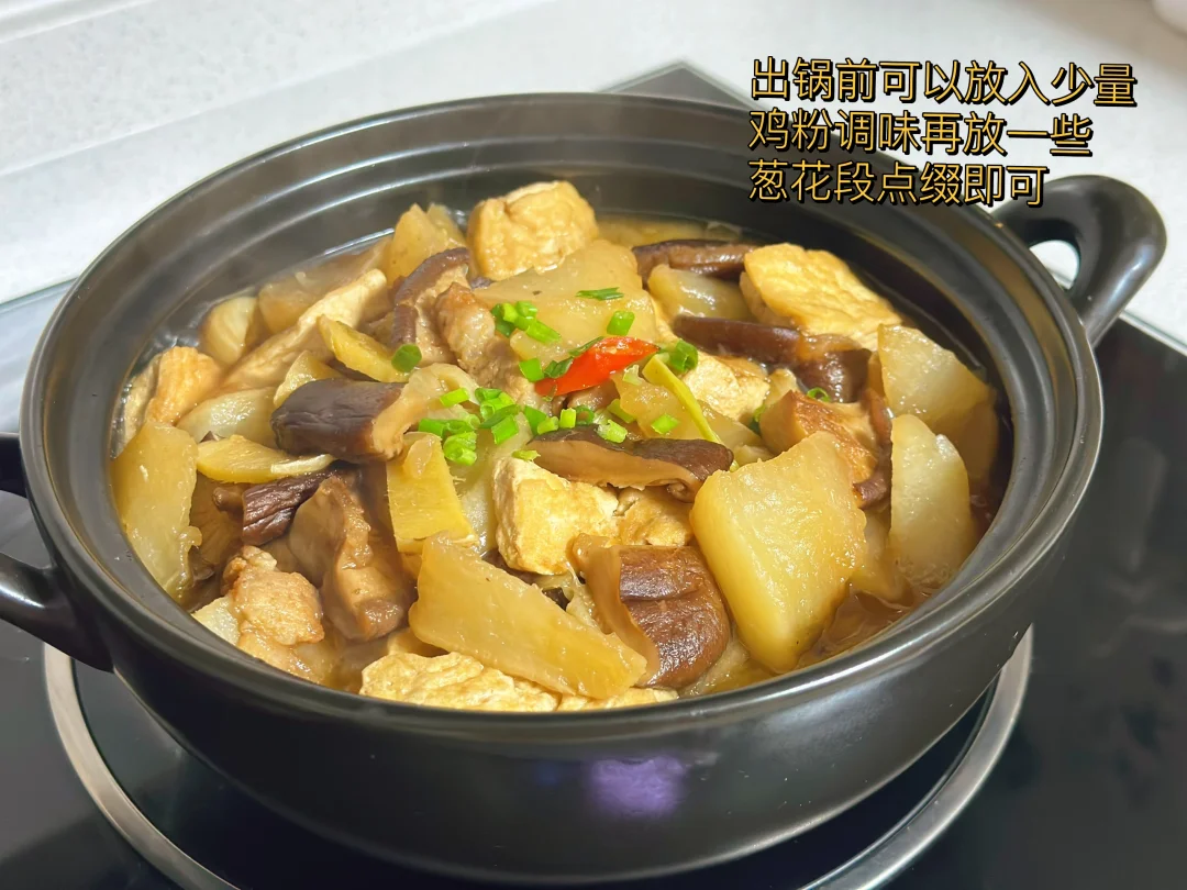 8. 再倒入适量刚才泡香菇的水进去这样煮起来会更香,砂锅盖上盖子中小火慢慢的把萝卜香菇煮透