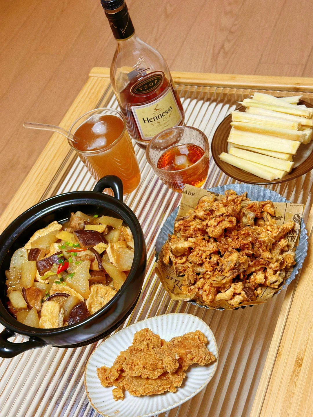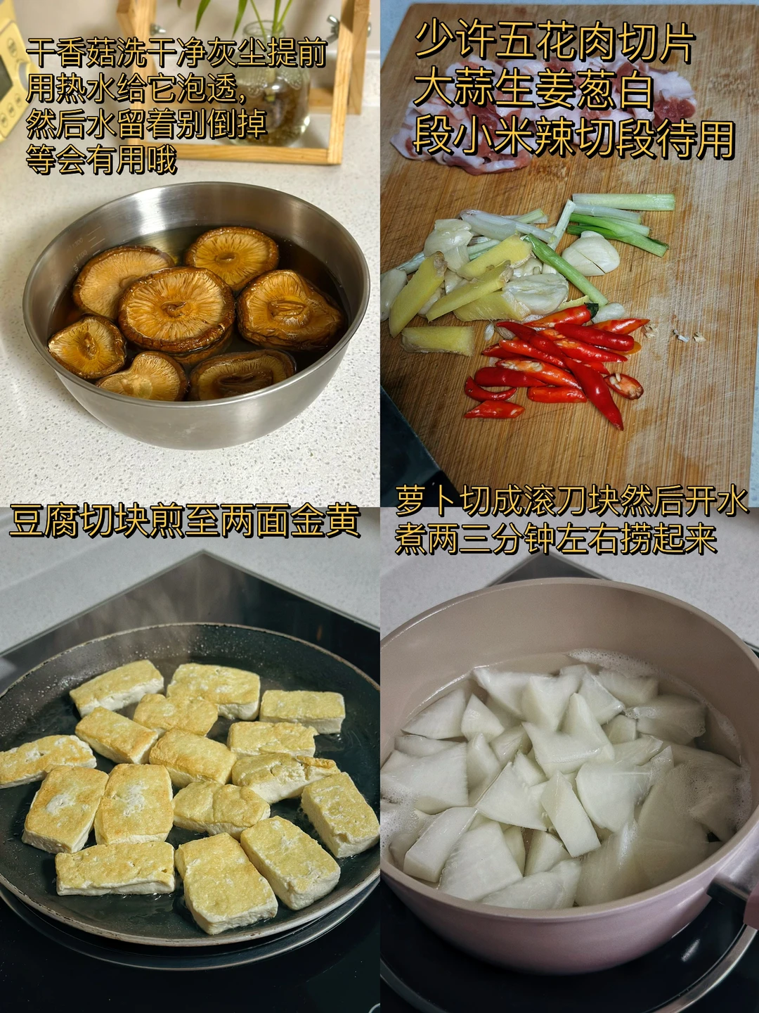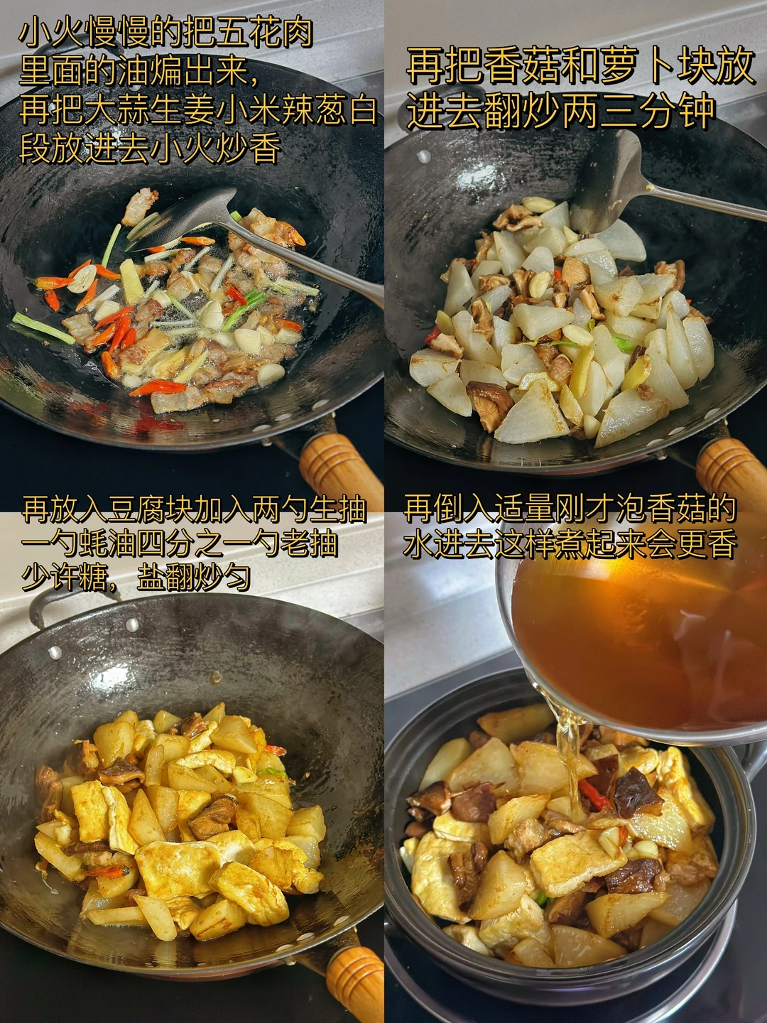 6. 再把香菇和萝卜块放进去翻炒两三分钟
