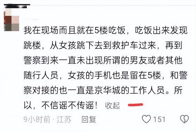 但这时候网上又传出另一条消息,有网友在网上说女子当天是自己去的商场,没有什么男友,更没有什么奶茶事件,网友表示事发当天正好在商场,看到了女子跳楼,而且从女子跳楼后到警察来,一直都没有人去女子的身边,就没有人认识她。
