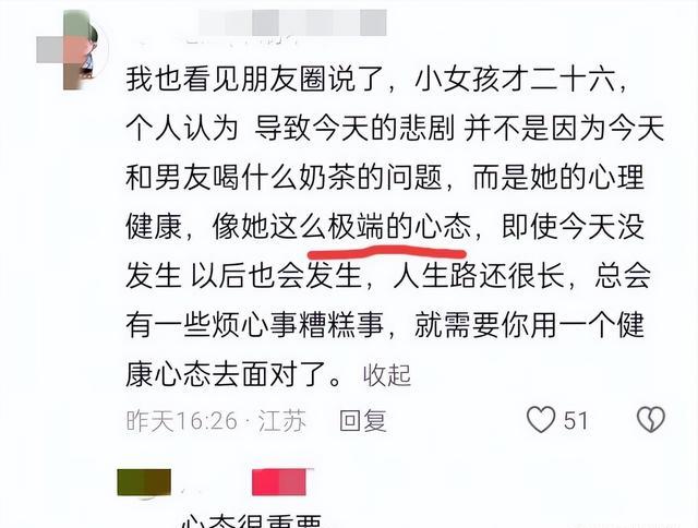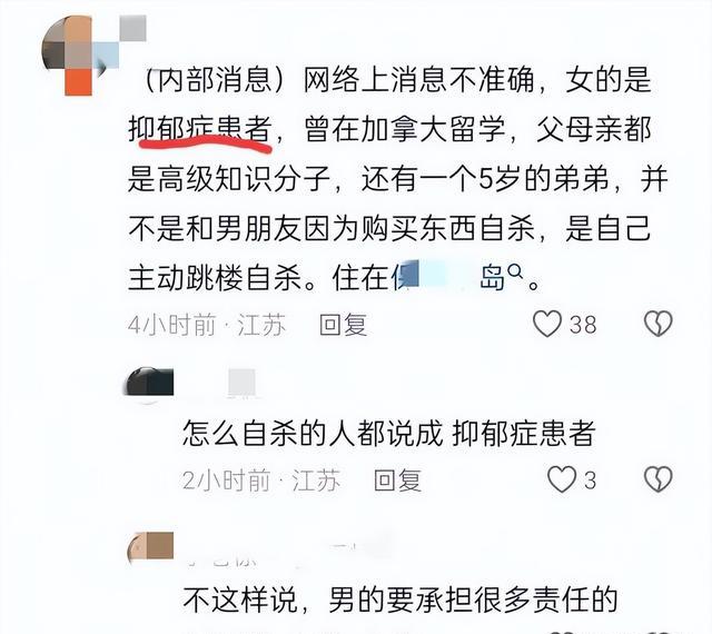 这样的说法让不少网友也对女子的跳楼有了了解,可同时对她男友产生了不满,难道她男友不知道她有抑郁症吗,如果知道了话为什么还要和她吵架,难道不能给她买一杯奶茶吗。