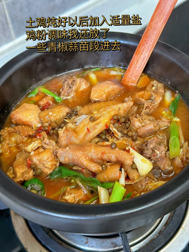 7. 土鸡炖好以后加入适量盐鸡粉调味我还放了一些青椒蒜苗段进去,看着就很诱人吧,还放了一些晒干的土豆片进去,每次这样能多吃好几碗饭