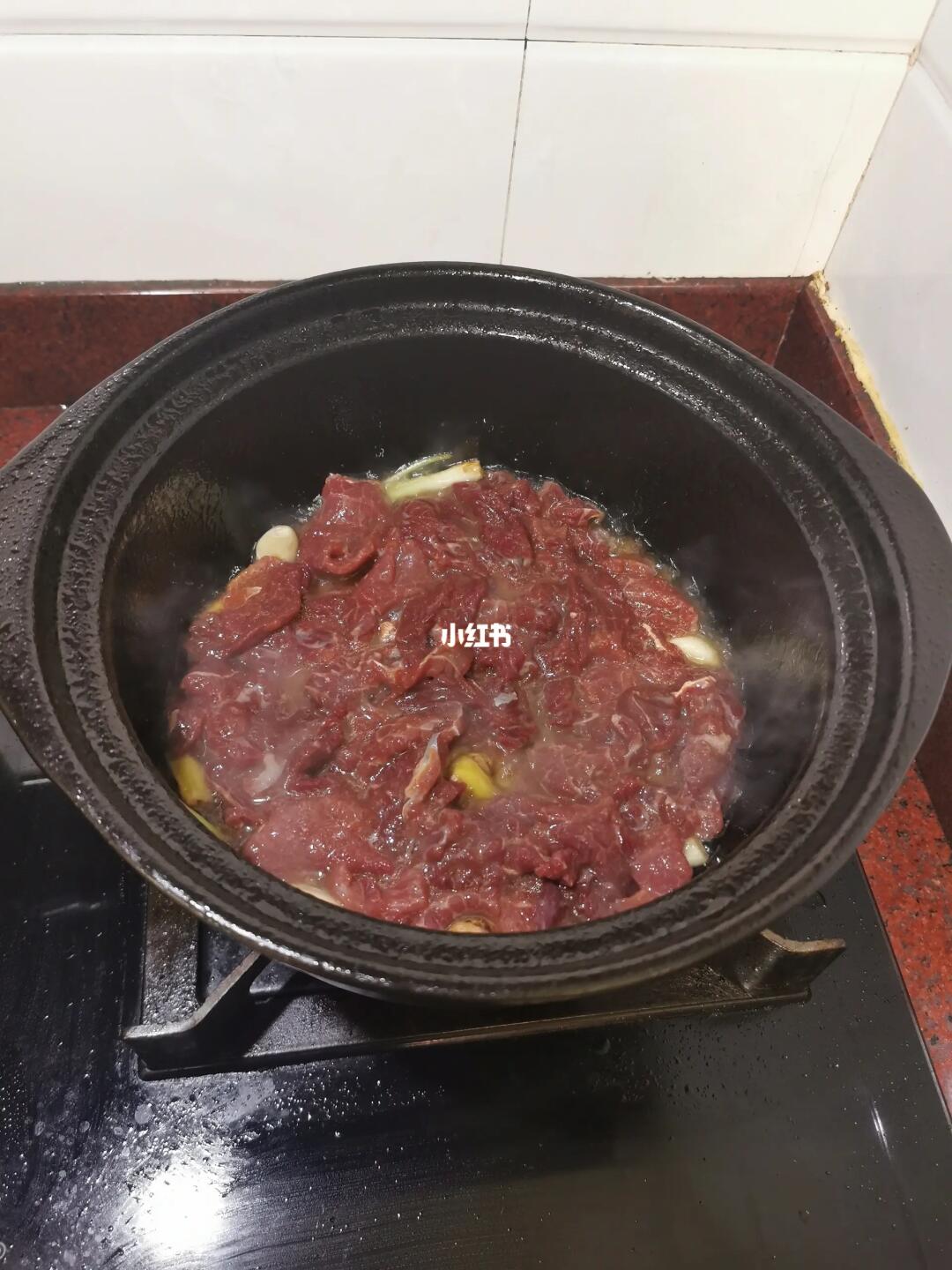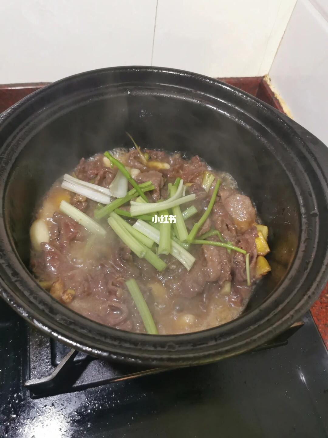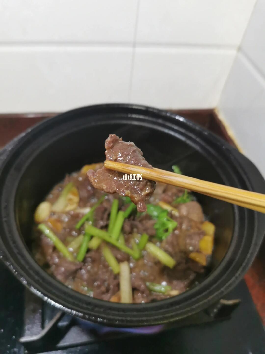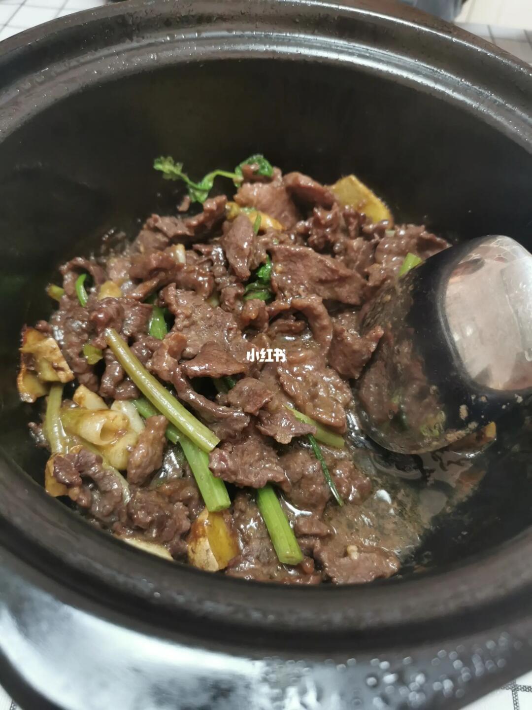 【2】、把砂锅烧至冒烟,加入花生油,加入姜、葱、蒜粒炒出香味,把牛肉放入砂锅里,盖上盖子,焗5分钟,打开盖子,搅拌一下,加入香芹,大火收汁即可关火。