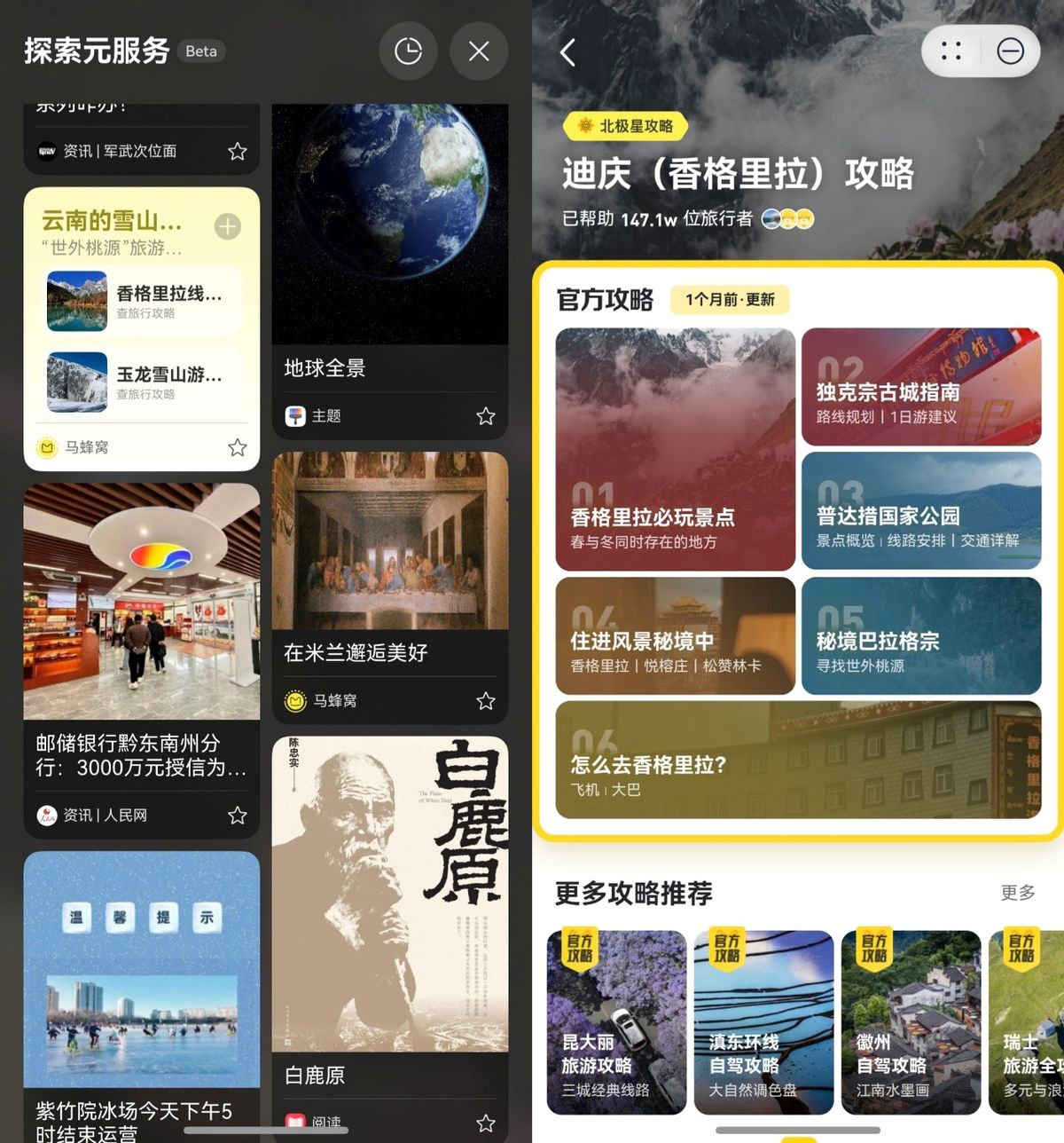 虽然春节我计划带家人出去玩,但没有想好目的地。要是搁以前,我得在各大旅游App之间反复横跳。但在「探索元服务」给我推荐了马蜂窝的“迪庆(香格里拉)攻略”卡片,点击卡片直接就能通过马蜂窝元服务浏览攻略,非常丝滑。这种无需下载、即点即用的轻量化体验,真的太省心了。