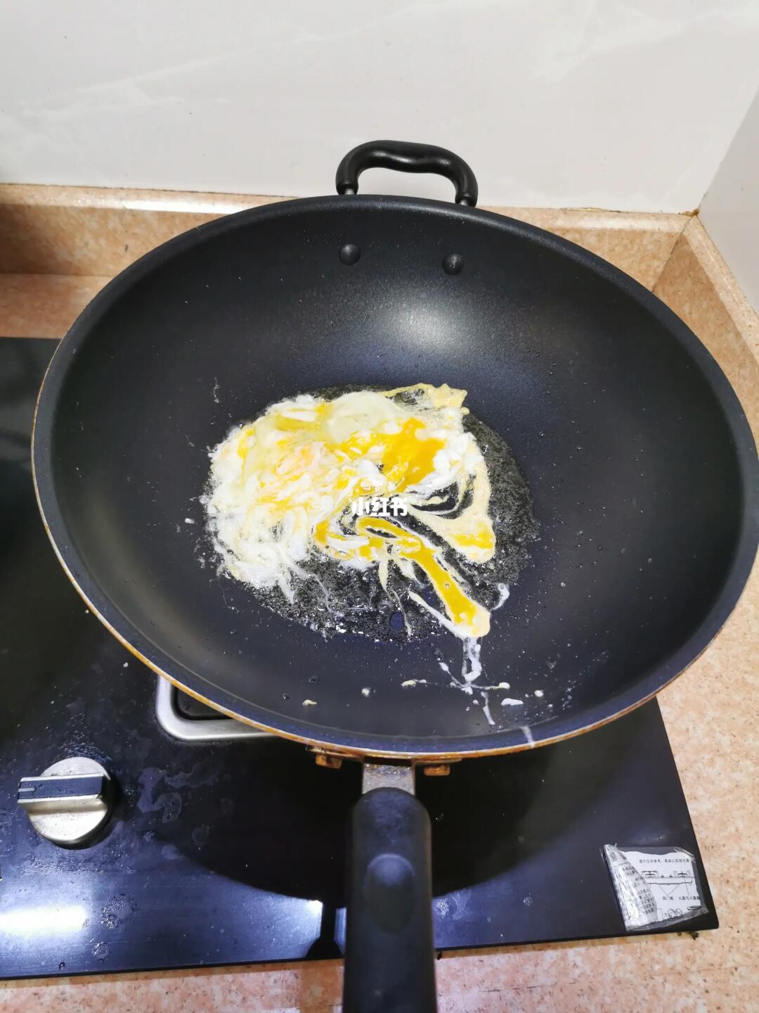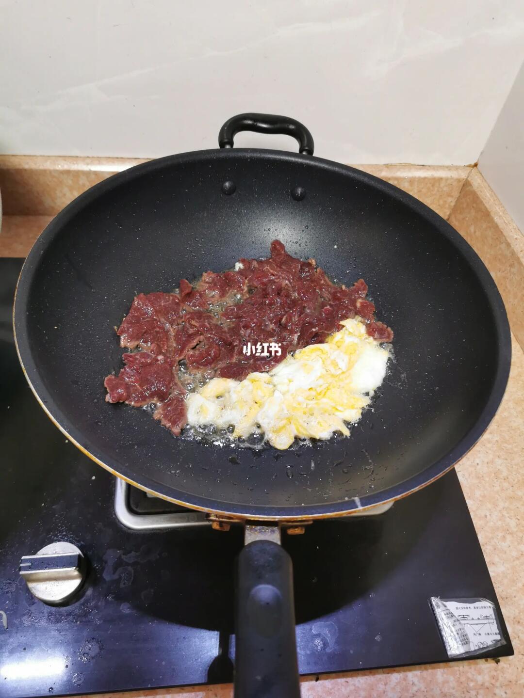 【3】、起锅热油,把鸡蛋打入锅里,搅散,把牛肉倒入锅里大火炒至变色,装出。