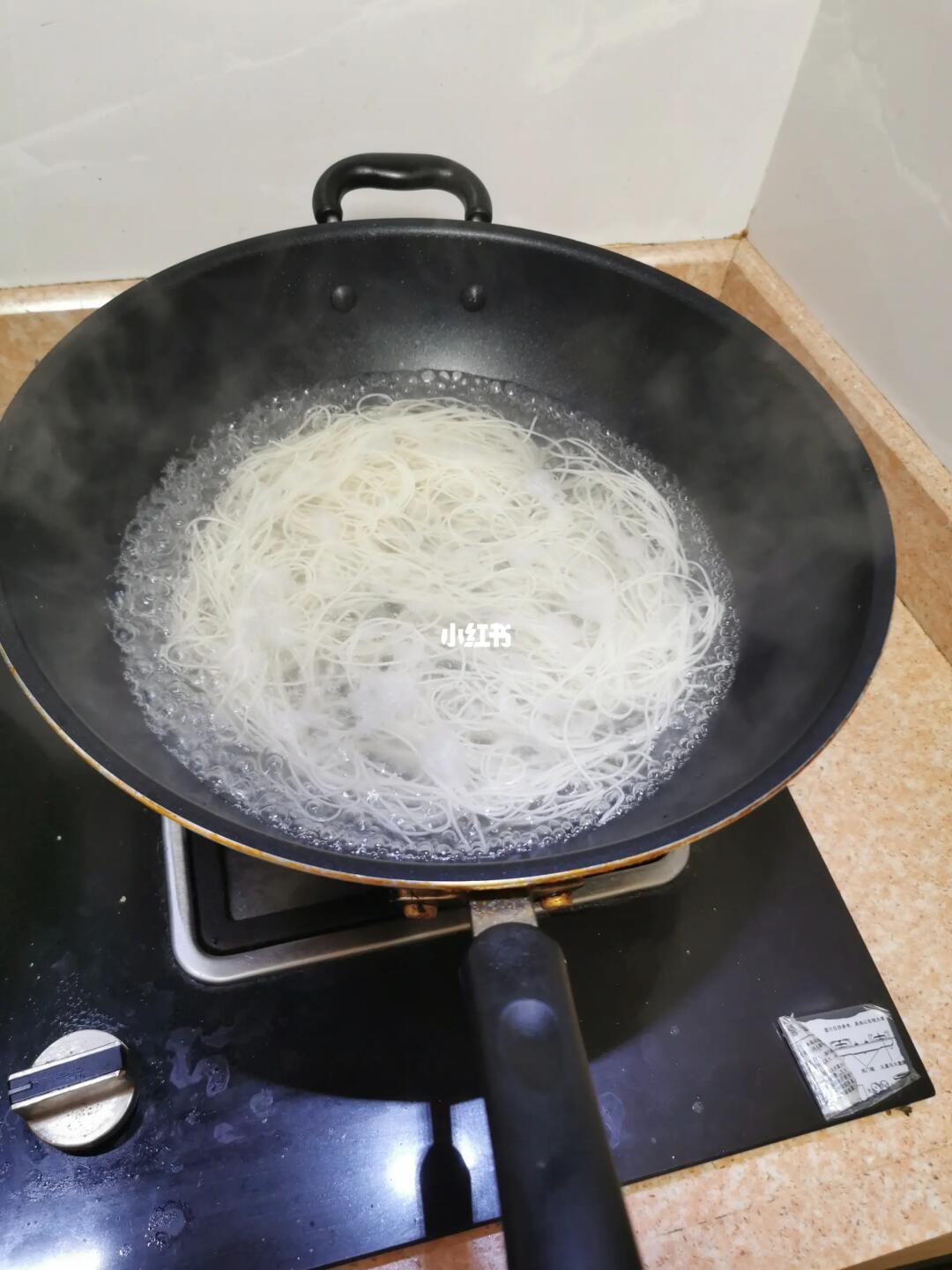 【2】、锅里烧开水,把面条放入锅里煮一分钟,捞出过冷水,控干水份,加入少许花生油搅拌一下防止粘连。