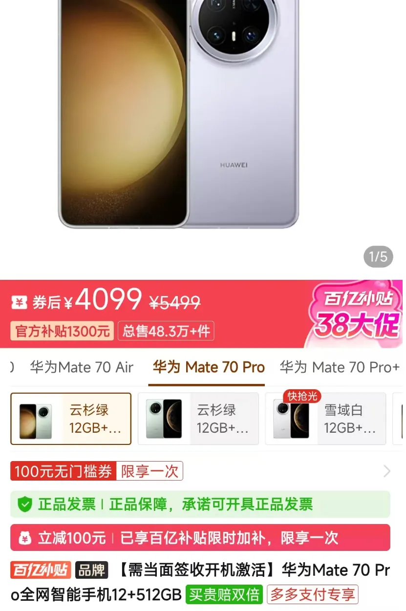 这次降价绝非小打小闹,数据说话不玩虚的:核心降价机型为Mate70 Pro 12GB+512GB版本,首发价6999元,当前正规第三方授权渠道叠加平台补贴、渠道让利后,到手仅4099元,直降2900元,相当于省出一部中端机的钱。