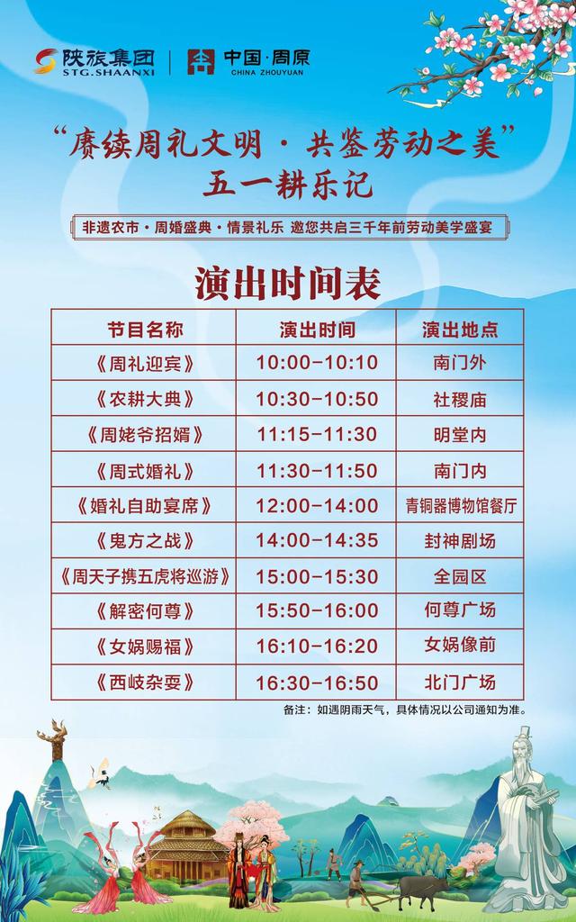 五一假期即将到来之际,陕西宝鸡岐山中国·周原景区以“赓续周礼文明,共鉴劳动之美”五一耕乐记为主题,通过农耕文化展演、非遗农产品展销、周式婚礼民俗体验、周礼沉浸演出等多元形式,激活三千年文明基因,打造文旅消费升级新范式,带您穿越千年,体验一场兼具历史深度与时代活力的文化盛宴。下面就带您提前解锁假期精彩纷呈的演出活动!