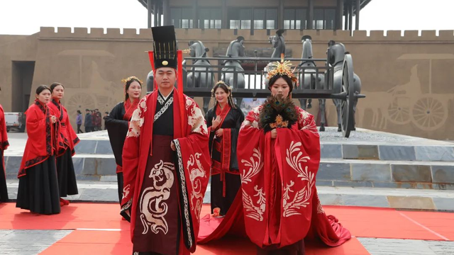 周式婚礼秀,邂逅古典浪漫。除此,景区还以婚俗为脉、礼乐传情,推出了“周老爷招婿”+“周式婚礼”+“婚俗宴席”一站式全景周礼民俗文化沉浸式体验。想当“乘龙快婿”?报名参与才艺PK、周礼知识问答,赢取挑战资格!当选“女婿”后,还能体验完整的周制婚礼“六礼”流程——进行纳采、问名、纳吉、纳征、请期、亲迎等仪式,婚礼结束后,还可纳礼进入景区青铜器博物馆餐厅体验舌尖上的岐山,一口千年风味,感受“礼乐宴飨”的周礼文化魅力。