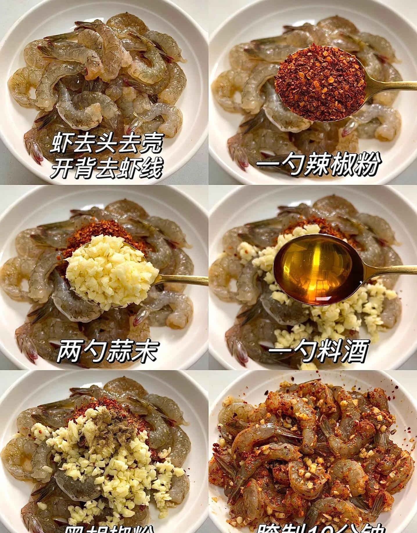 接着加入辣椒粉、蒜末、料酒和黑胡椒粉腌制,这一步能让虾肉更加入味。