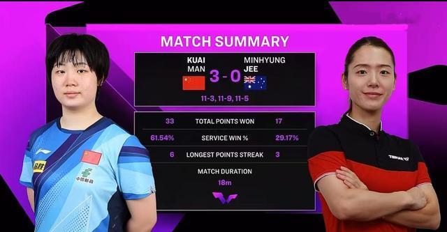 池旼亨先以2-0领先,接着蒯曼很厉害地连续得了6分,池旼亨把比分追到4-6。在比赛的中后段,池旼亨以5-8落后了。然后蒯曼又强力地连续得了3分,以11-5赢下第三局。这样蒯曼就以3-0的大比分完胜澳大利亚的韩裔选手池旼亨,进入女单16强,恭喜蒯曼。