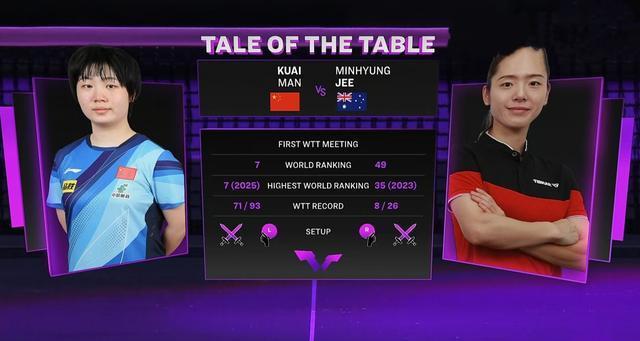 国乒女单有个21岁的新星叫蒯曼,她先出场比赛,对手是澳大利亚的韩裔选手池旼亨。蒯曼21岁,在女单世界排名第7。池旼亨38岁,世界排名第49。