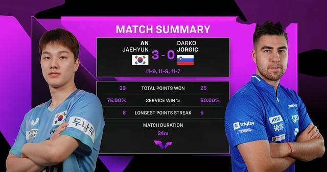 世界排名第29的日本选手宇田幸矢,在0-2落后的情况下连赢三局,逆转了世界排名第16的德国名将杜达;世界排名第25的韩国选手安宰贤,以3-0的比分完胜世界排名第14的斯洛文尼亚名将达科。男单的这两场1/16决赛结束后,获胜的都是世界排名比较低的球员。