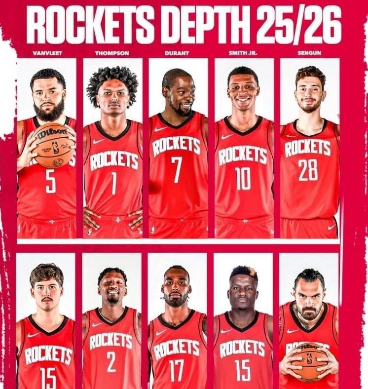 火箭队豪华阵容分析火箭队这次也组成了一个14人的豪华阵容,看起来挺有实力的。预计首发应该是范弗利特、阿门、杜兰特、小史密斯和申京这五个人。替补方面也有不少好手,像谢泼德、霍勒迪、奥科吉、芬尼-史密斯、伊森、泰特、杰夫-格林、亚当斯和卡佩拉,阵容挺齐整的。这套组合其实挺有竞争力的,关键在于人员搭配很合理。特别是杜兰特,他现在可以在场上专心得分,不用再去做那些防守或者抢篮板之类的脏活累活了,这样他的效率应该会更高。