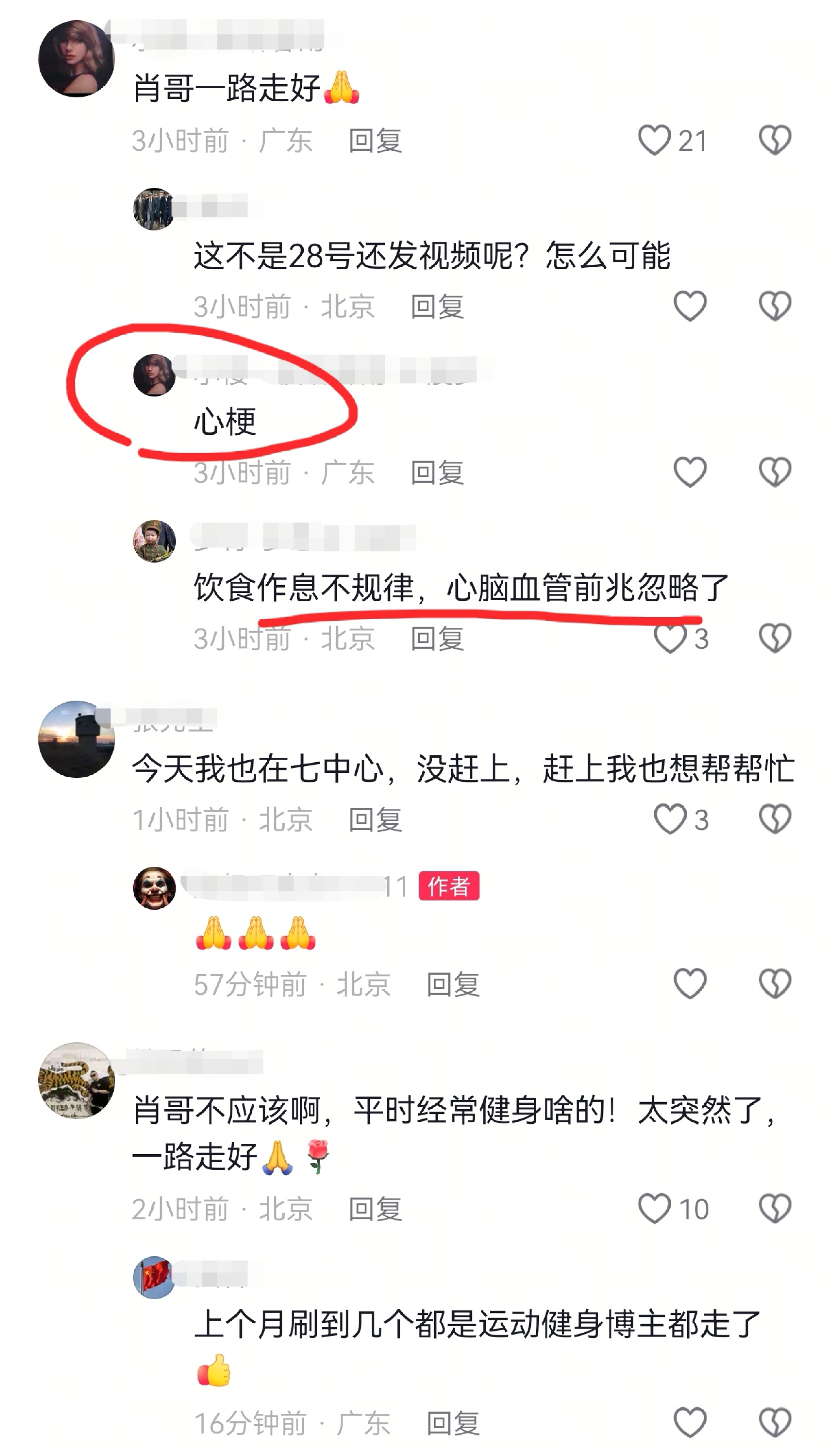 肖哥的朋友并未透露原因,但网友从肖哥日常的生活和表现推测,很可能是突发心梗等问题,否则不至于走得那么快,平时没听说他有什么身体问题,给人的感觉就是很健壮。