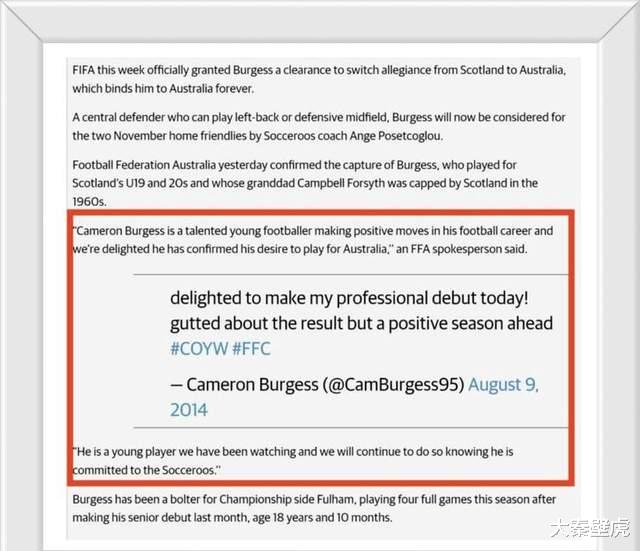 在解释过程中,该博主认为,伯吉斯曾代表苏格兰青年队出场过,18强赛又代表澳大利亚青年队出场,而在网上并没有查到该球员的转籍信息。
