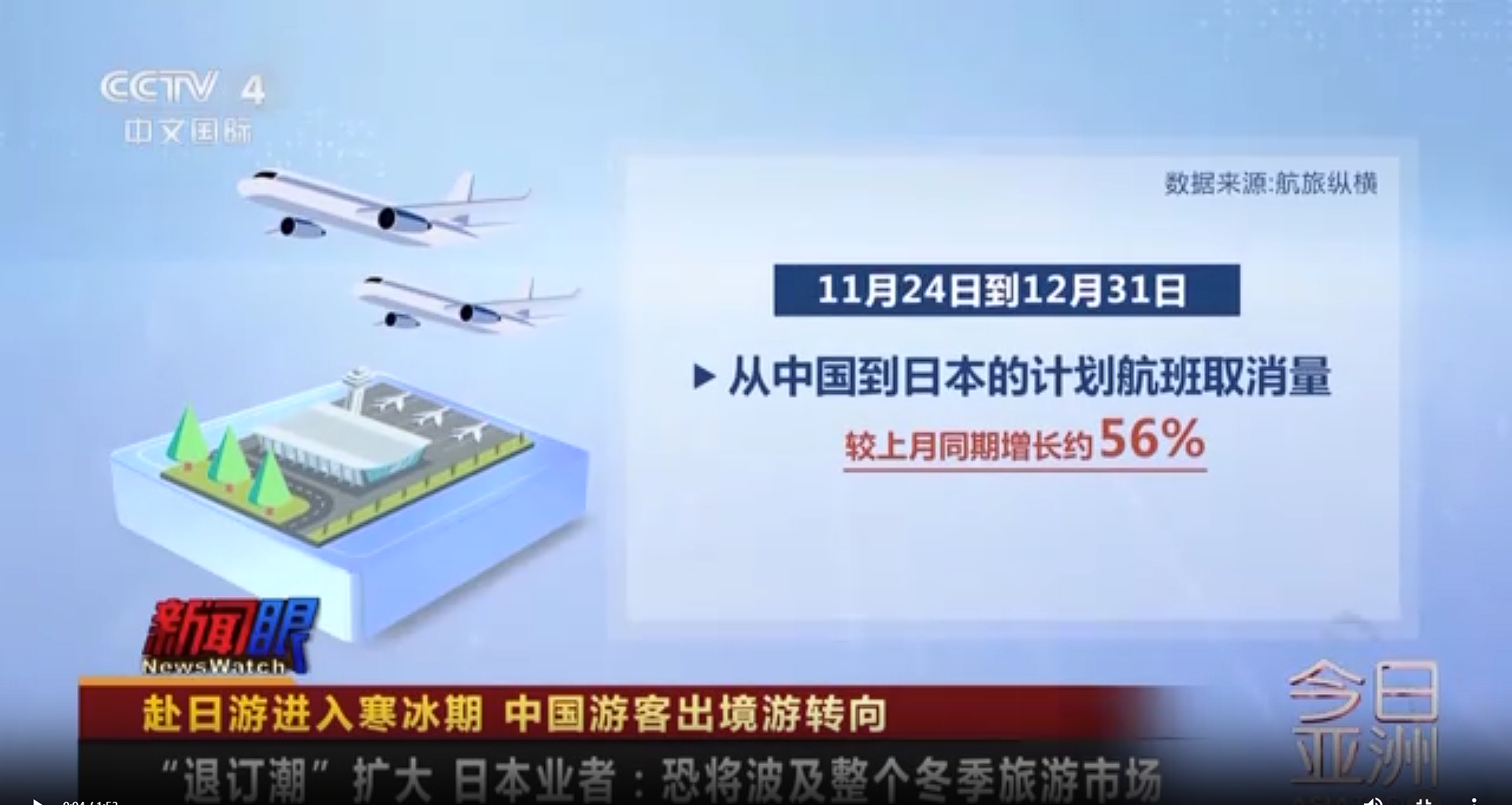 航旅纵横数据显示,11月24日至12月31日中国赴日航班取消量激增56%。12月原计划5548班次航班中,904班被取消(占比16%),15.6万个座位“蒸发”。国航、东航等航司紧急出台免费退改政策,覆盖12月31日前全部日本航线。旅行社方面,团体游因“无法成团”被迫退费停团,携程等平台甚至介入协助取消酒店订单。