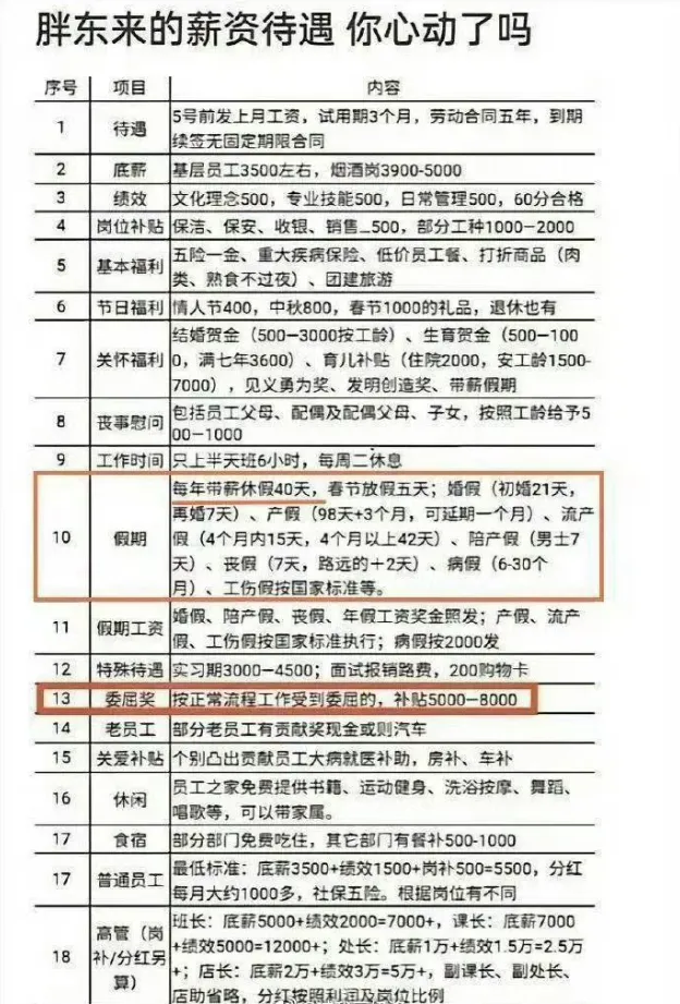 而这张图是之前胖东来的福利说明,除去1-5项的基础员工待遇标准以外,还有高达13个额外福利项目。这种福利更是其他企业无法达到的。也许这就是胖东来吸引员工的魅力所在。胖东来不会和你谈理想,不会给你画大饼,只会把经营过程中获得的利润分多一点给员工就可以了。单凭这一点,其他企业就不会去学。话也说回来,其实很多的企业员工薪酬底,其实并不是公司不赚钱,而是老板不愿意把赚的钱分多一点给员工罢了。