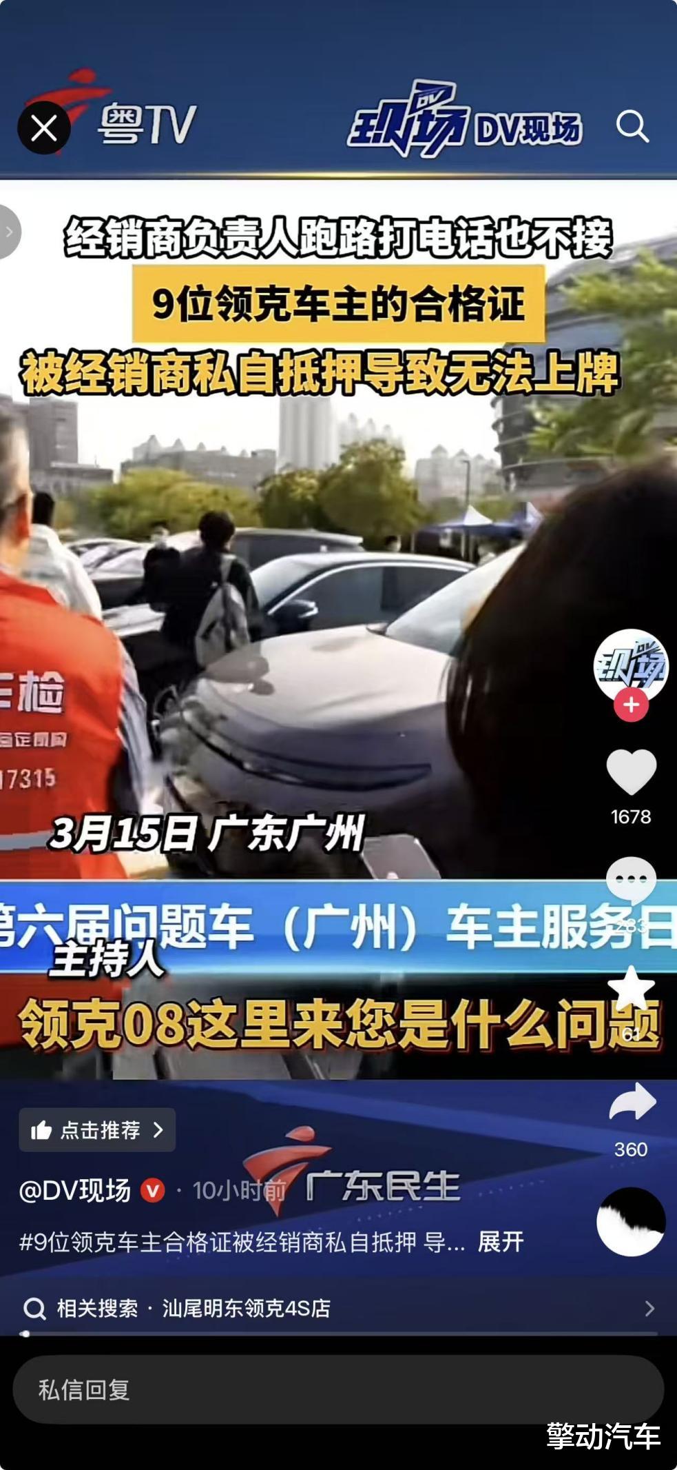 3 月 15 日,第六届广州问题车车主服务日现场,9 位领克车主集体维权,控诉汕尾明东领克 4S 店将车辆合格证私自抵押给第三方金融机构,导致新车购置近一年仍无法上牌,3 张临牌到期后车辆只能停在车库闲置。车主表示,多次向经销商和厂家反馈问题,如今经销商负责人已失联,厂家此前的处理态度也令其不满。