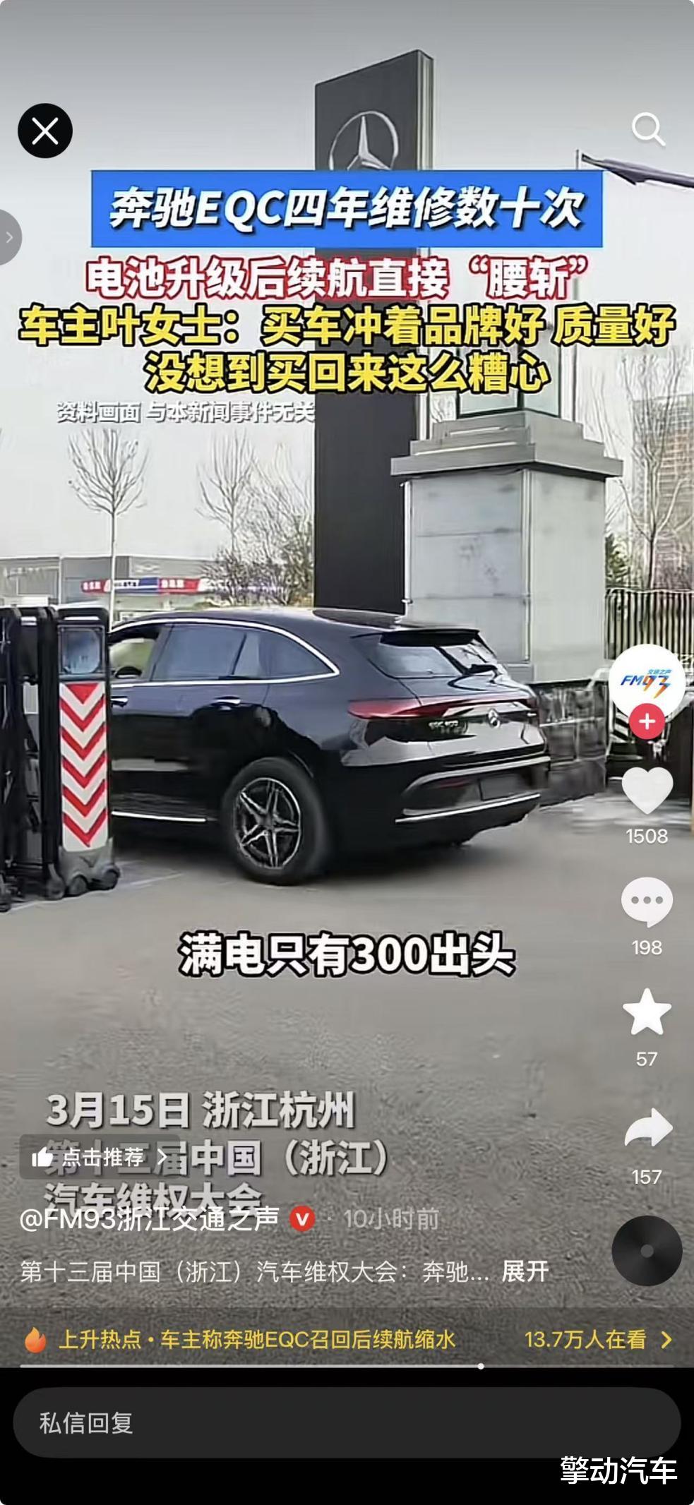 3 月 15 日,第十三届中国(浙江)汽车维权大会现场,奔驰 EQC 车主叶女士发起维权,控诉其购买的车辆四年内维修数十次,2025 年厂家电池升级后,车辆续航更是直接 “腰斩”,从原本满电 400 多公里骤降至 265 公里,严重影响使用。