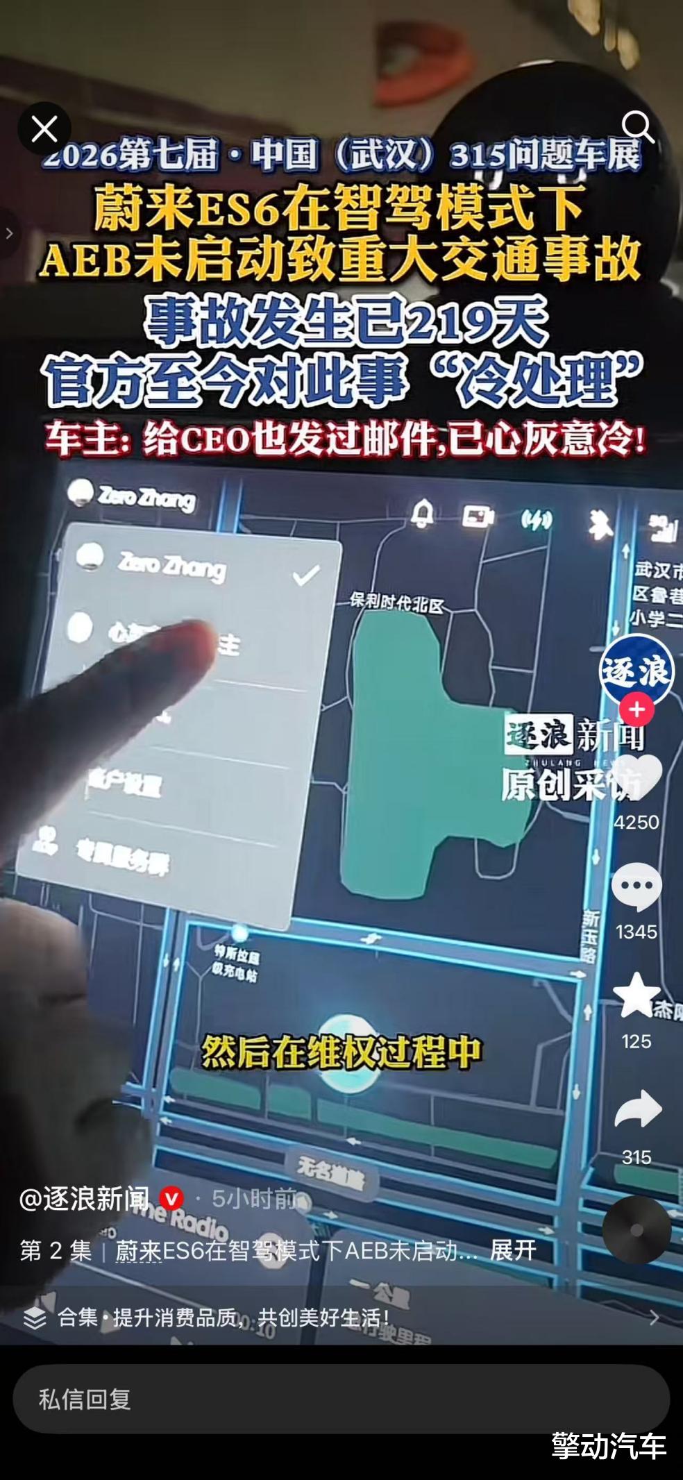 3 月 15 日,2026 第七届中国(武汉)315 问题车展现场,一位蔚来 ES6 车主发起维权,控诉车辆在开启智能驾驶模式时,自动紧急制动系统(AEB)未及时启动,引发重大交通事故,事故发生后 219 天,蔚来官方始终冷处理,维权毫无进展。