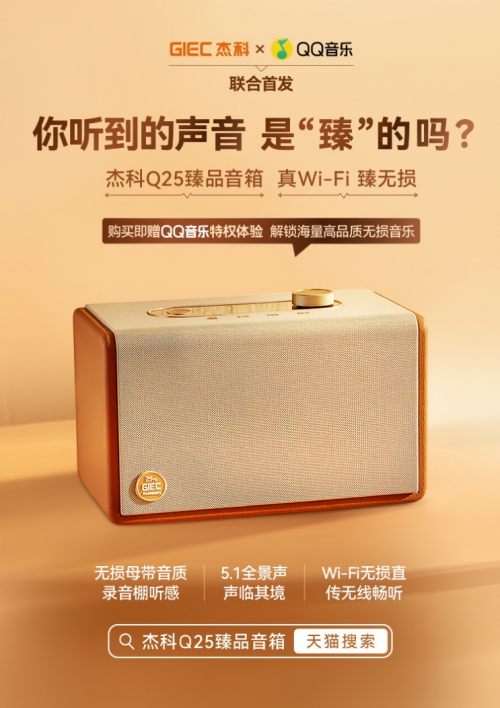 近日,国内影音科技品牌杰科(GIEC)与QQ音乐共同宣布,推出首款支持QPlay3.0技术的无线音箱产品「杰科Q25臻品音箱」。QQ音乐的QPlay3.0技术借助Wi-Fi高带宽优势,突破蓝牙传输码率限制,成为国内在线音乐流媒体平台首个兼顾无损音质、低时延空间音频体验的无线传输方案。