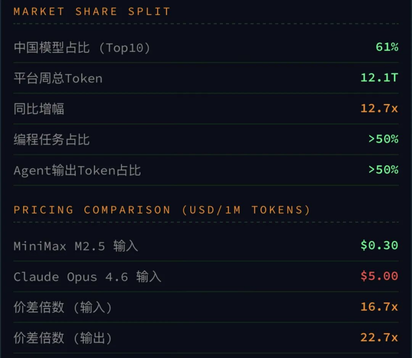 OpenRouter平台公开定价显示,海外头部模型Claude Opus 4.6 每百万Token输出价格高达25美元,而 MiniMax M2.5仅需 1.1 美元,价格差距达22.7倍;智谱GLM-5每百万Token输出价格2.55美元,仅为Claude Opus 4.6的9.8%。按企业级Agent每日10亿Token消耗计算,使用Claude月成本45万美元,而使用MiniMax仅需3.6万美元,单月成本差距超40万美元。对于初创企业、中小开发者而言,这种成本差距直接决定生存与发展,全球开发者用实际选择为国产模型投票。