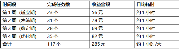 数据记录:每日记录任务数量、完成时长、获得收益,形成完整数据集。
