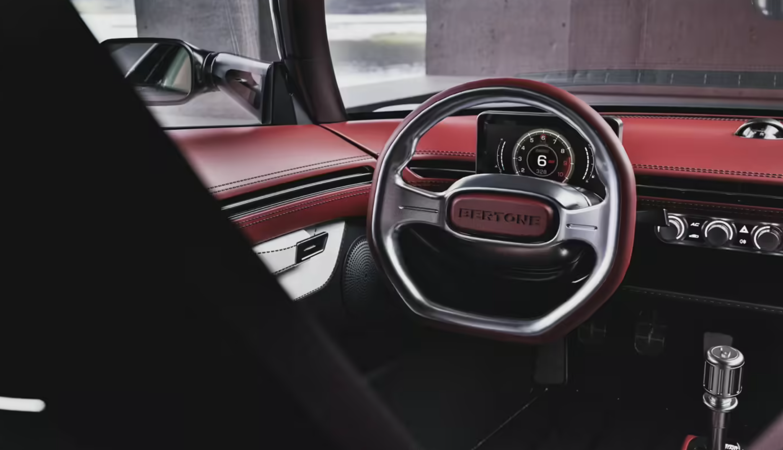 Bertone Runabout量产版车型车内采用了红白皮革材质的铺陈,还配备了两个桶装赛车座椅,六点式安全带,将乘客牢牢固定在座位上。中控台配备了双幅式金属方向盘,操控岛区域配备了银质金属的换挡拨杆,正前方配备了全液晶仪表,右侧还保留了圆形空调旋钮,一切都是上个世纪的跑车模样。