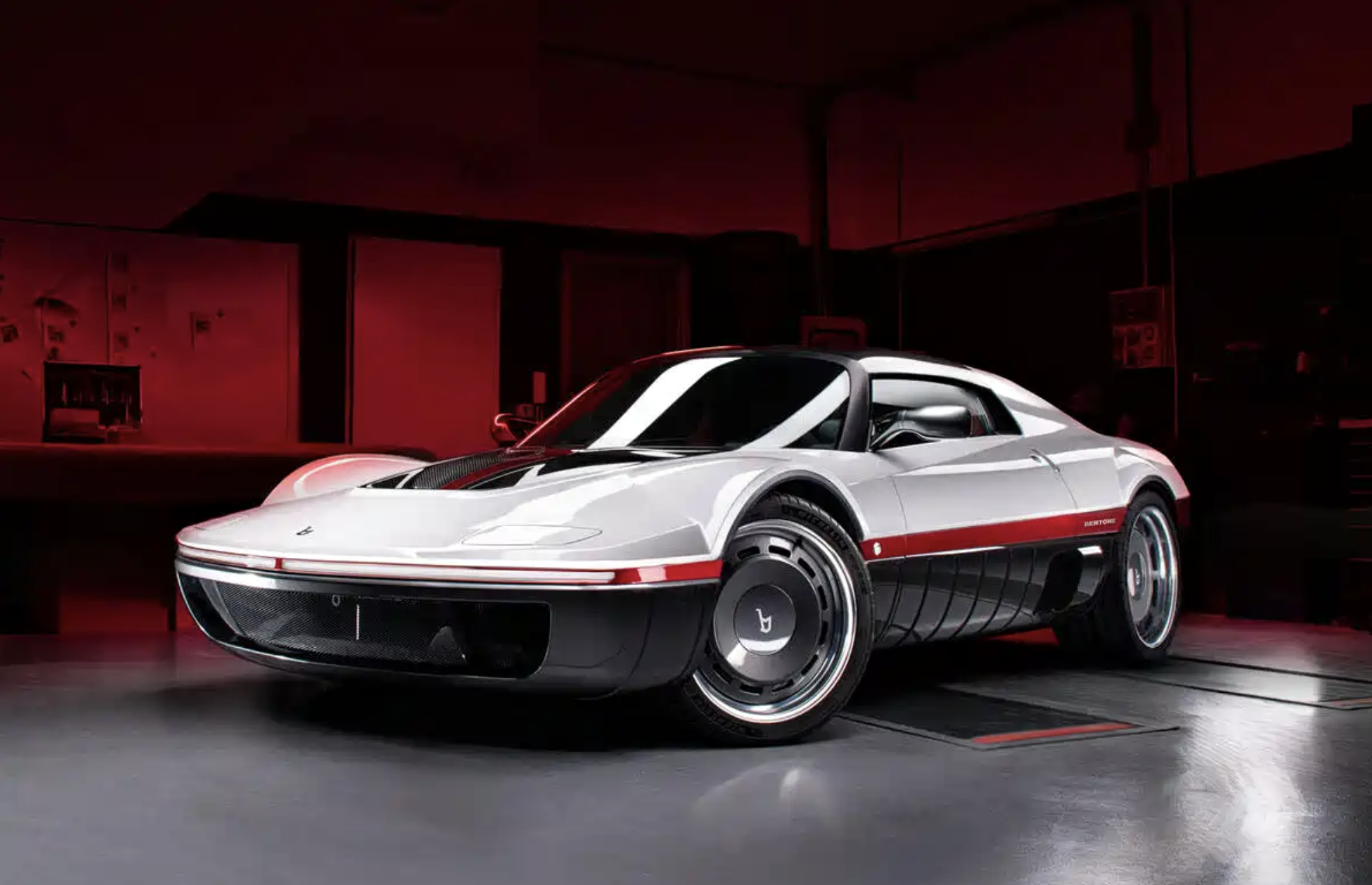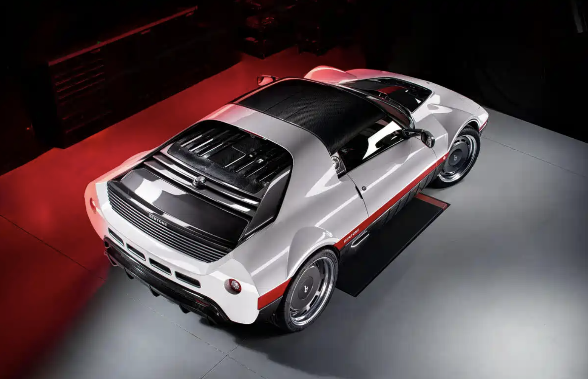 Bertone Runabout量产版车型,它的概念原型车在1969年由马塞罗·甘迪尼执笔设计,基于路特斯Exige车身打造。整车采用了经典的楔形跑车轮廓,将提供无挡风玻璃版和可拆卸硬顶的Targa版本。机械式的门锁。19英寸的铝合金饼状轮圈,似乎将我们带回了20世纪80年代,与法拉利512 tr、兰博基尼Countach有着异曲同工之妙。
