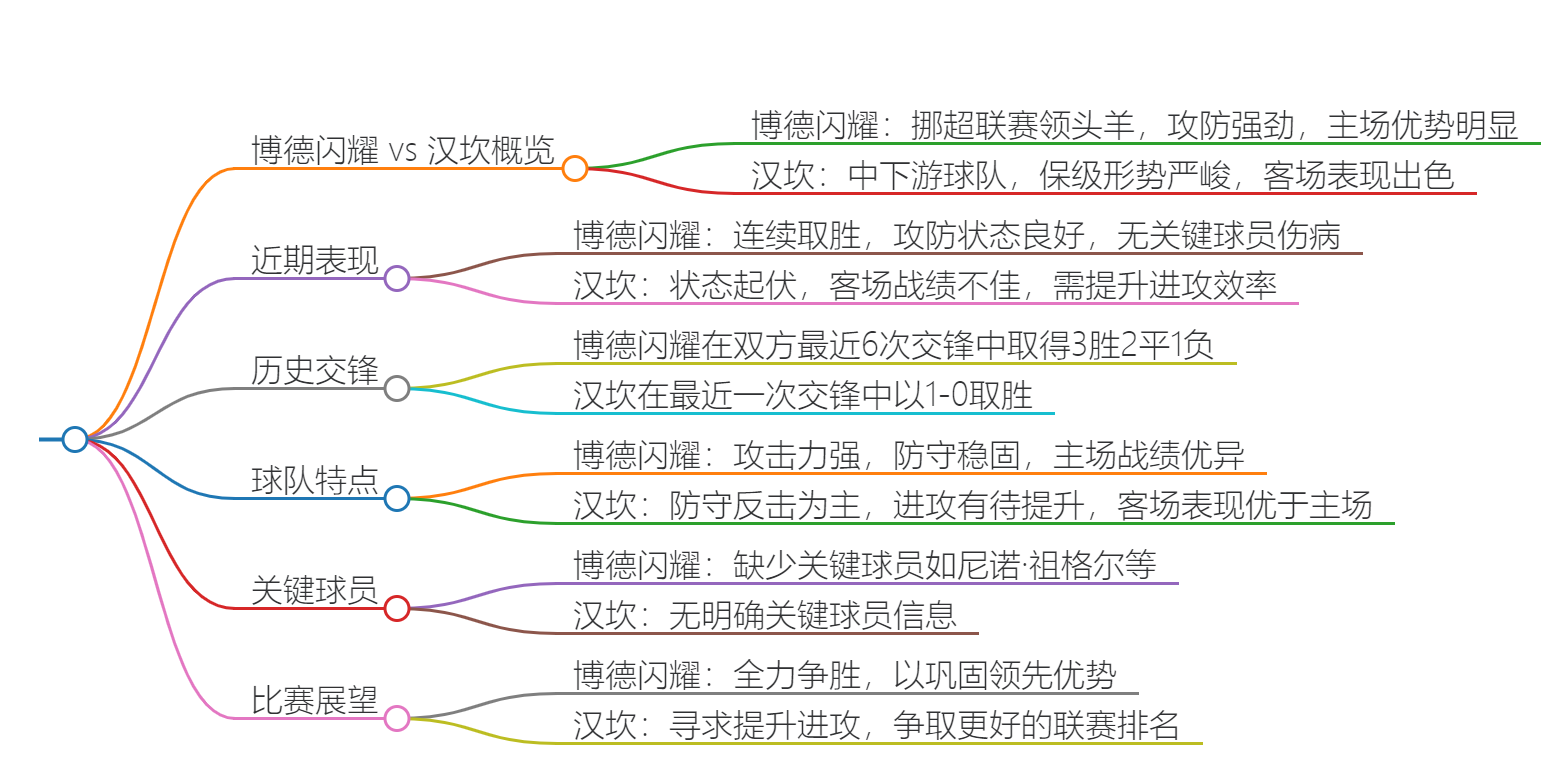 汉坎:实力在挪超属于中下游水平,本赛季暂时排在第 9 名。整体表现一般,进攻和防守能力较为均衡,但面对强队时表现不佳。他们本赛季在客场的比赛中取得了 4 胜 3 平 3 负的成绩,不过最近的一个客场是在上个月的月底 0-3 输给了莫尔德,且在上一场战平桑德菲杰之后,已经连续两轮不胜。目前领先降级区 5 个积分,保级压力相对较小。但连续两轮不胜可能会影响球队的士气,客场挑战领头羊博德闪耀,球队在心理上可能处于劣势。
