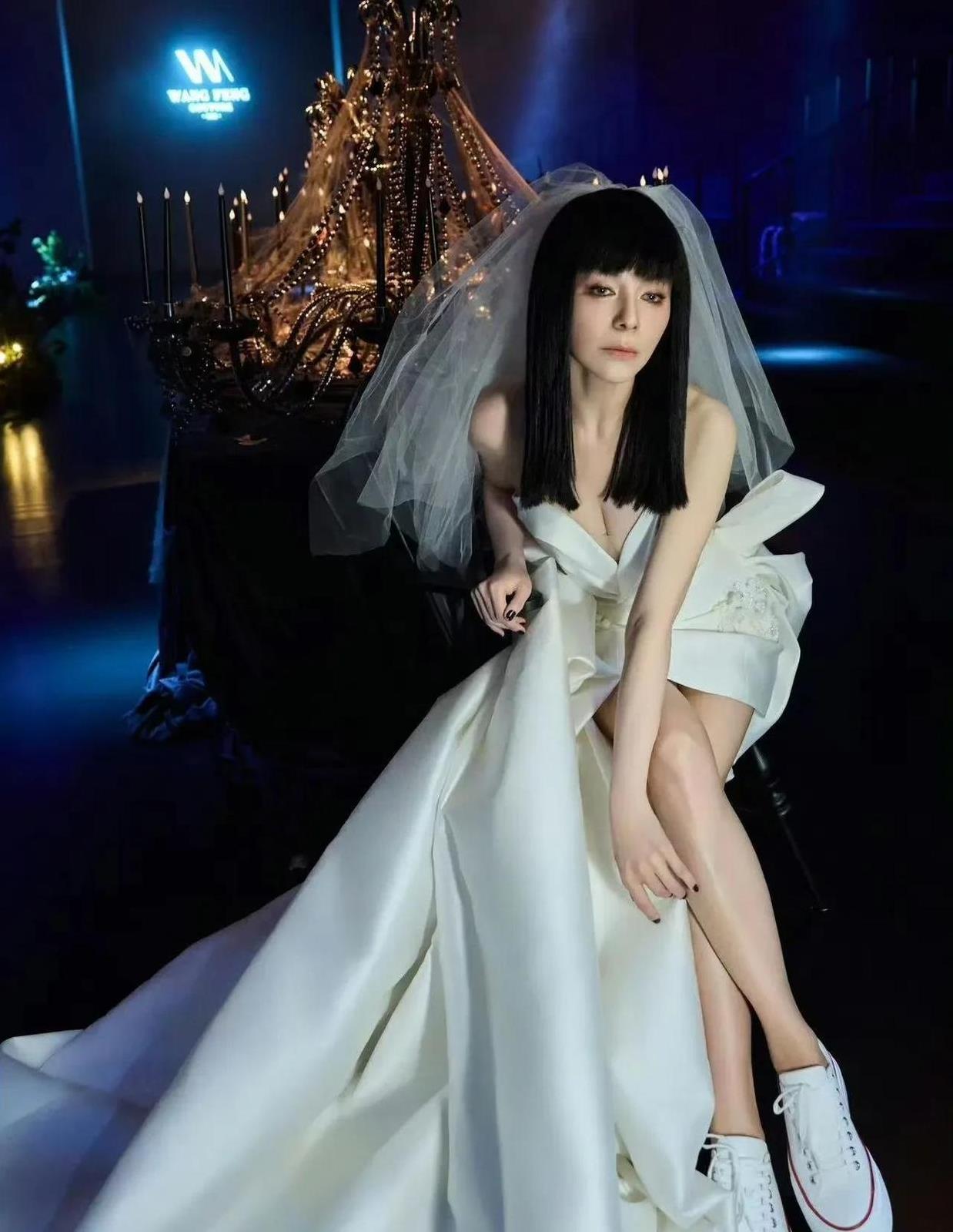 王琳出席WANGFENG秀场化身清新少女在时装周的WANGFENG秀场上,王琳一出场就特别吸睛!她穿了一件白色的婚纱裙,黑色的长直发配上蓝色的眼睛,再加上一双活力满满的帆布鞋,整个人青春感爆棚,感觉都快溢出屏幕了!