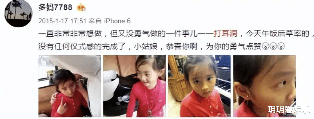 2015年,妈妈孙莉在微博晒出黄多多打耳洞的照片。